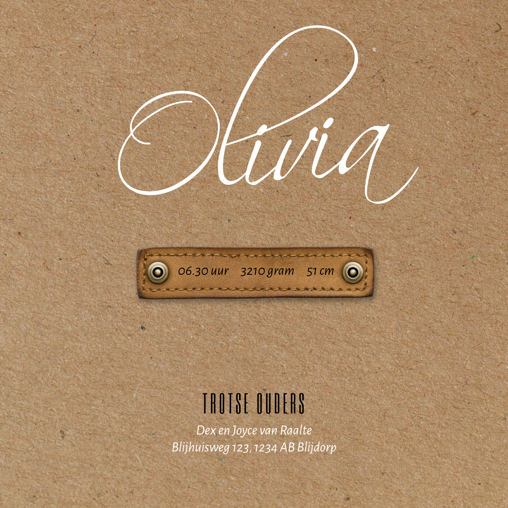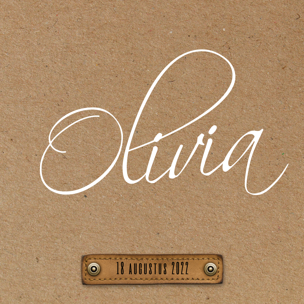 Een basic geboortekaartje voor een meisje met karton op de achtergrond. Bij dit geboortekaartje Olivia is er gebruik gemaakt van een sierlijk lettertype en een leren label.
