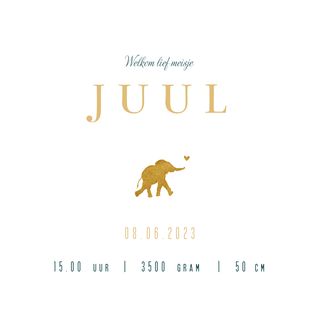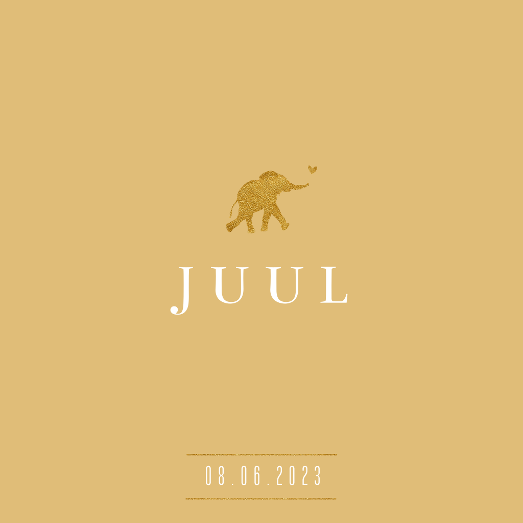 Basic geboortekaartje voor een dochter in een mooie combinatie van zacht geel met wit en goudkleur. Op dit babykaartje Juul staat een goudkleurig olifantje. Verder heeft deze kaart een rustige uitstraling en de kleuren en lettertypes zijn gemakkelijk aan te passen.