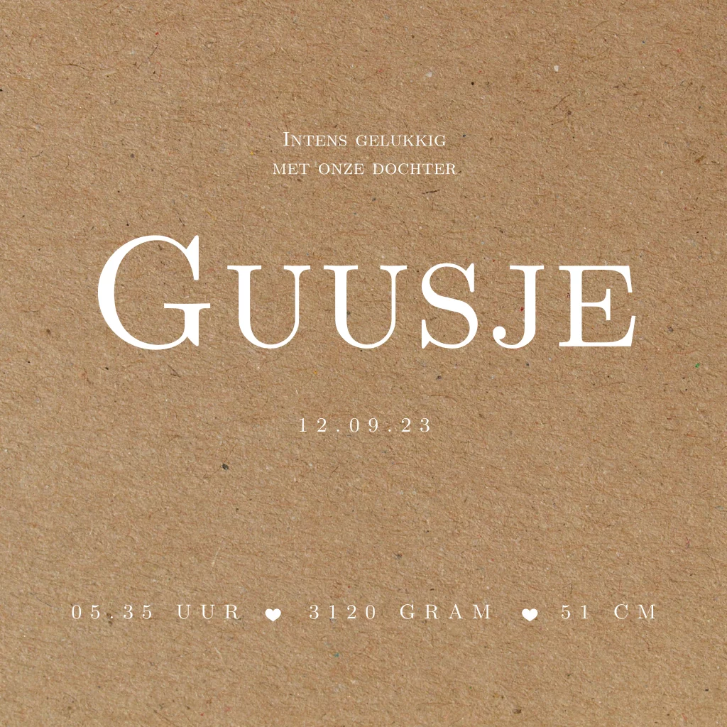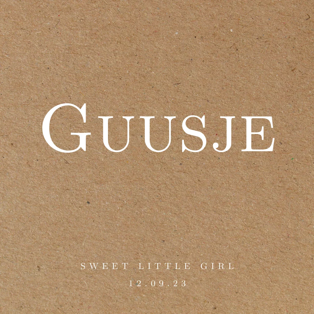 Basic geboortekaartje voor een meisje op een kartonnen achtergrond. De teksten en lettertypes van dit kaartje Guusje zijn aan te passen in de editor.