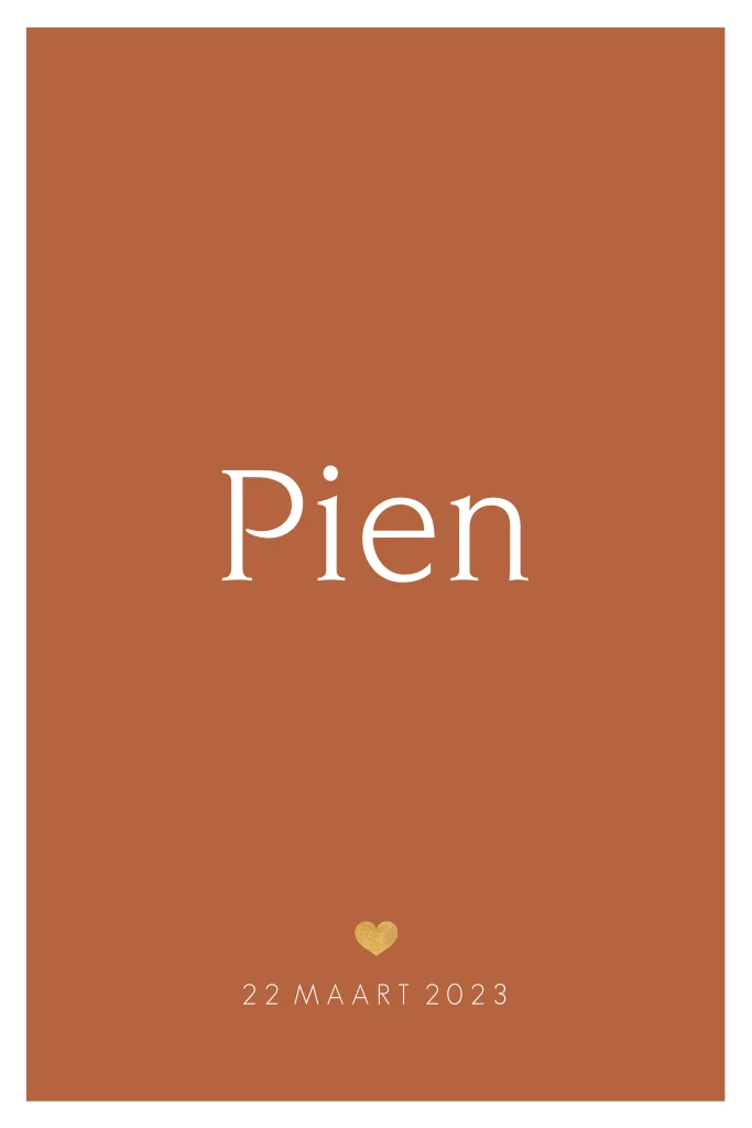 Basic geboortekaartje voor een meisje in de trendy kleur roestbruin met wit. Dit kaartje Pien heeft een rustige uitstraling en een lief klein hartje. Kleuren en lettertypes zijn eenvoudig aan te passen in de editor.