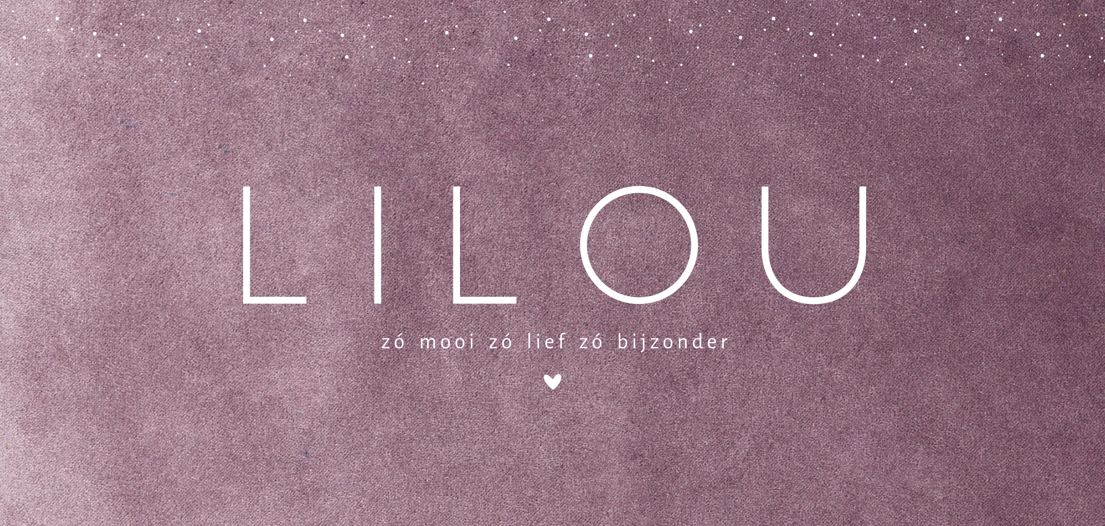 Een strak geboortekaartje voor een meisje met kleine stipjes en een hartje. De babynaam Lilou staat in een strak lettertype op de kaart. Een mooie kleurencombinatie van een paarse velvet achtergrond en witte tekst. Pas dit kaartje naar je eigen wensen aan de de editor.