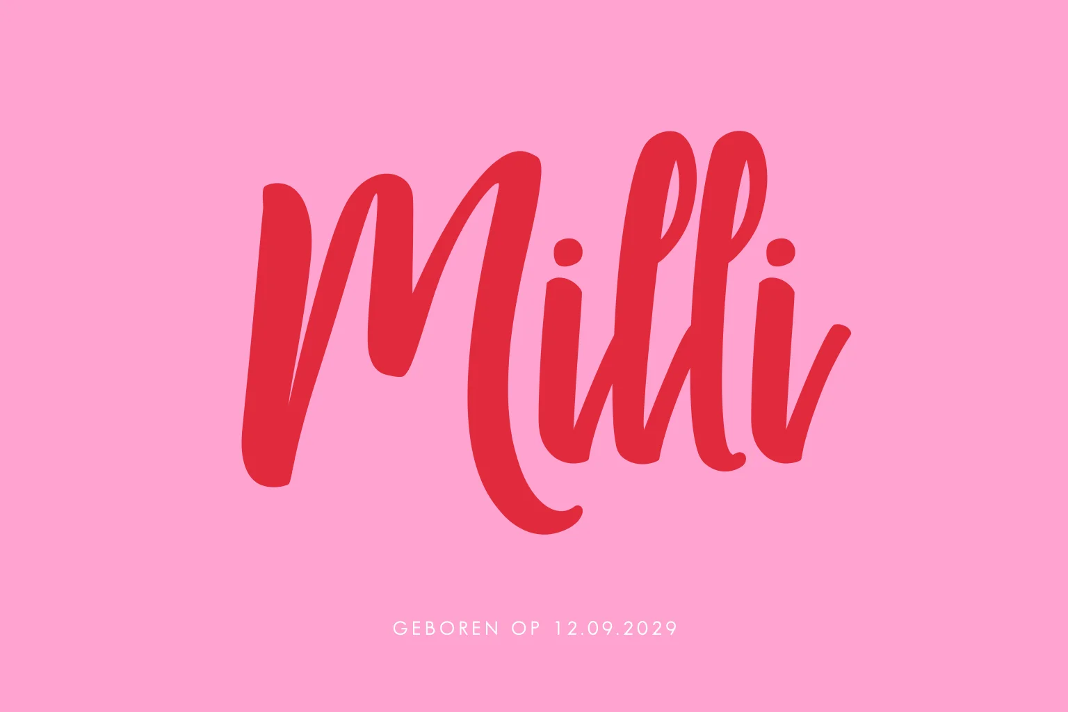 Geboortekaartje met een basic design, maar door het gebruik van felle kleuren springt hij er helemaal uit. Zeg zou zelf, hier worden we toch helemaal vrolijk van! De babynaam staat in vuurrood op een knalroze achtergrond, gecombineerd met een witte basis tekst. Pas dit kaartje Milli naar je eigen smaak aan in de editor.