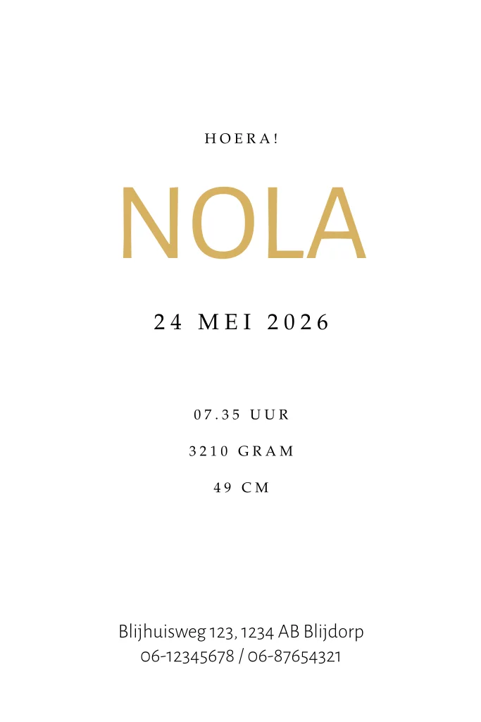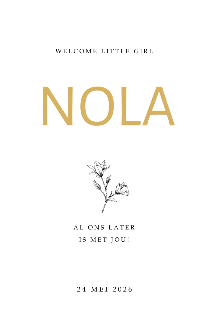 Rustig meisjes kaartje met een getekende bloem. Dit geboortekaartje in zwart wit met de babynaam in goudkleur is gemakkelijk naar jouw eigen wensen aan te passen.