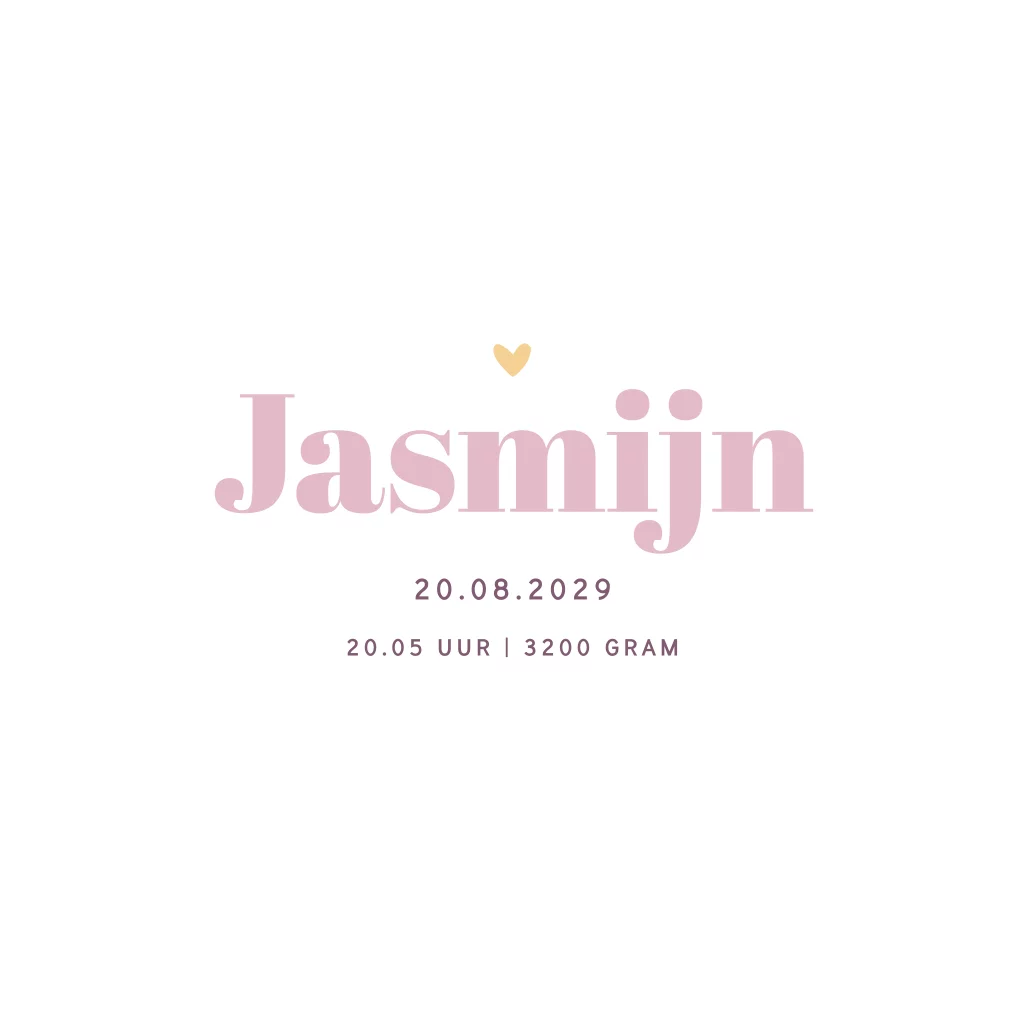 Schattig geboortekaartje voor een meisje met pastelkleurige aquarel bloemetjes. Dit geboortekaartje Jasmijn heeft een donkerpaarse achtergrond waardoor de bloemetjes goed uitkomen. Pas de kleuren, lettertypes en afbeeldingen makkelijk zelf aan in onze online editor en bestel eerst een drukproef!