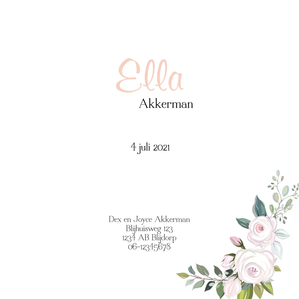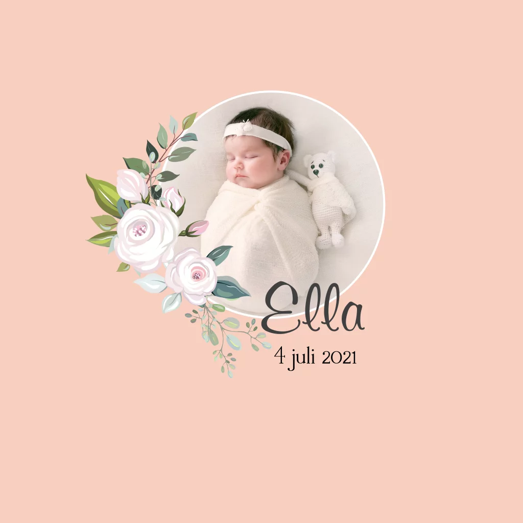 Een lief foto geboortekaartje voor een meisje. De bloemen, roze rozen, maken de kaart een tikkeltje romantisch. De babyfoto hoeft voor deze kaart niet in een cirkel uitgesneden te worden. Boven de foto is namelijk een laag met cirkel uitsnede geplaatst. Kom je er niet uit? Laat het dan gerust weten!