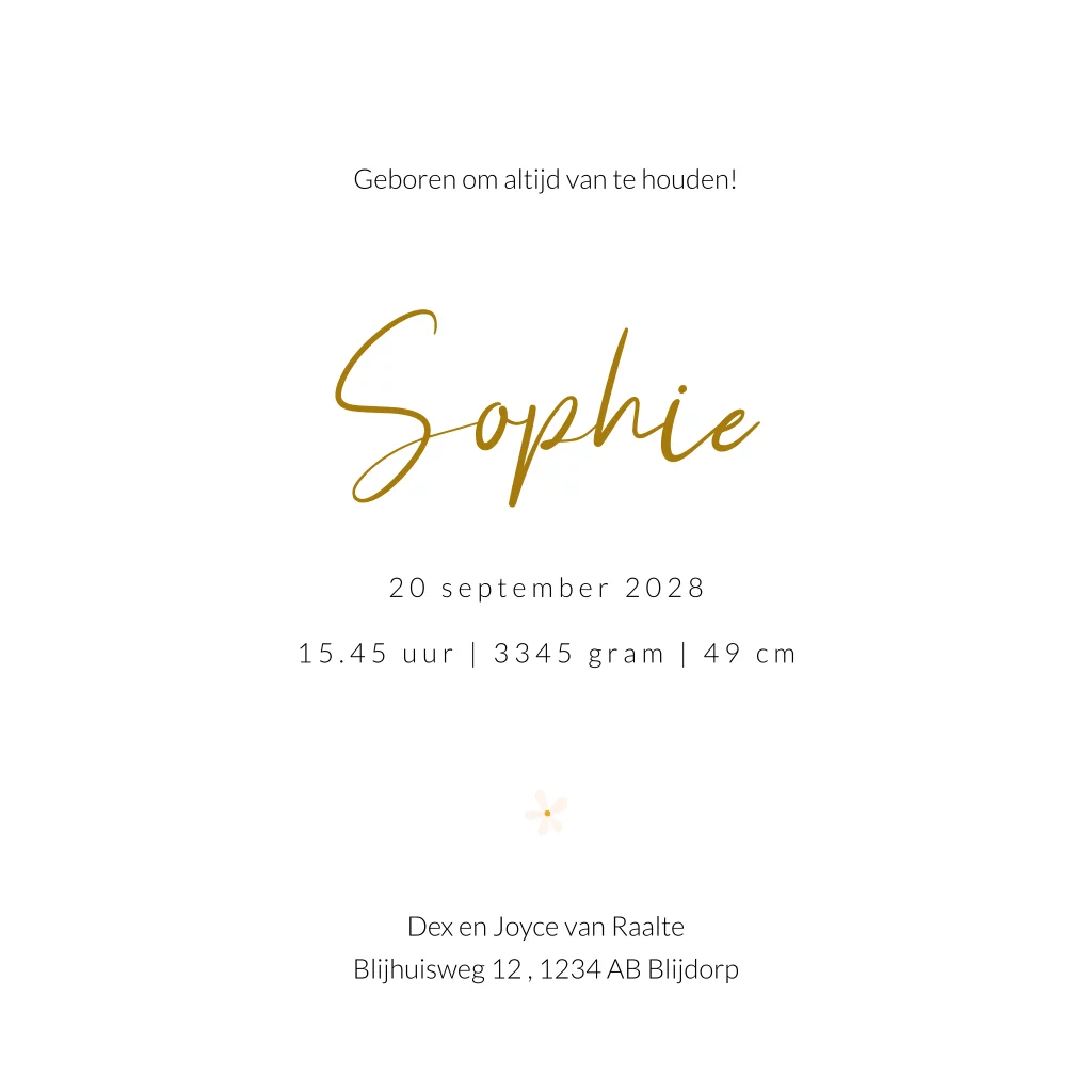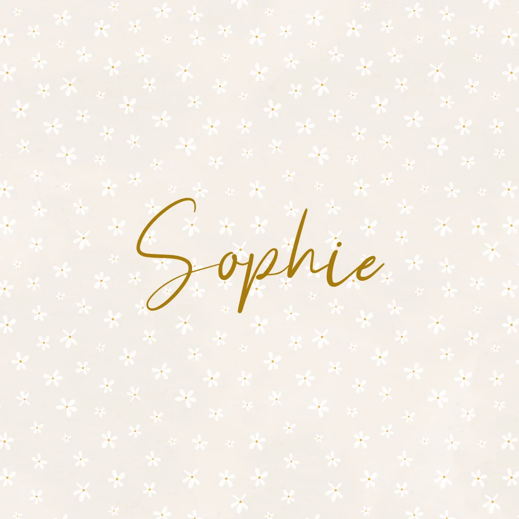 Dit prachtige geboortekaartje met een lief bloemenpatroon is perfect voor de aankondiging van de geboorte van jullie dochter. De warme achtergrond in combinatie met de witte bloemen geeft een rustige en lieflijke uitstraling. Pas de teksten, lettertypes en kleuren van dit geboortekaartje Sophie eenvoudig aan in de editor. Hulp nodig bij het ontwerpen? Neem contact met ons op!
