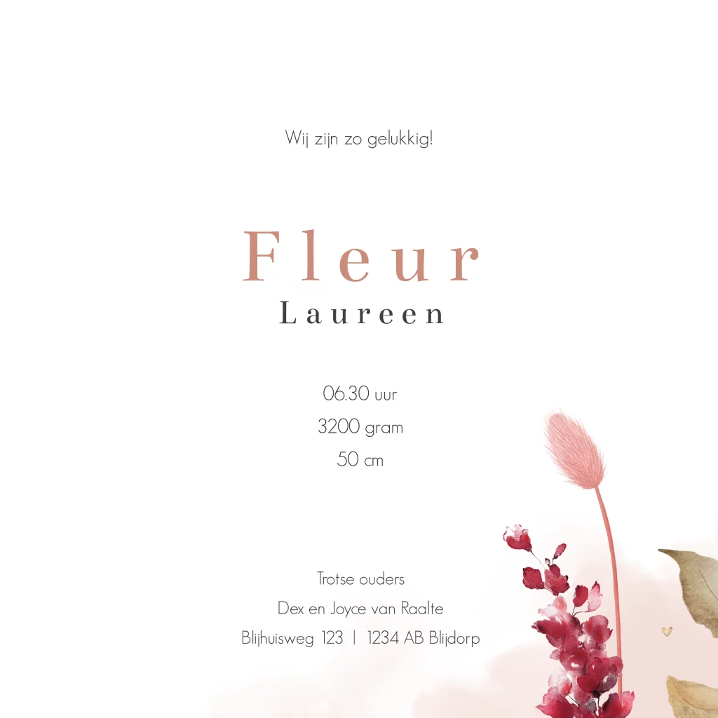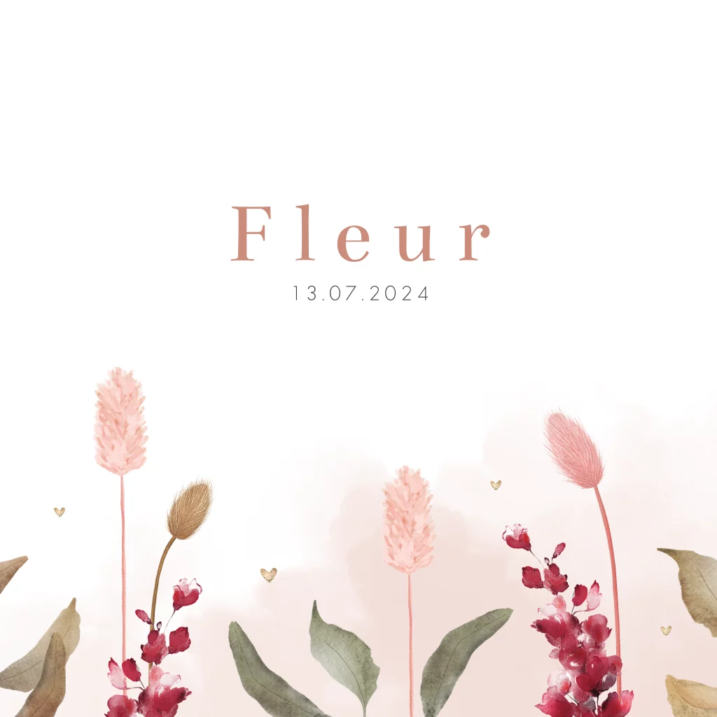 Rustig geboortekaartje met botanische bloemen en planten in roze en groene tinten. Hou je van een rustig babykaartje met veldbloemen, dan is deze kaart zeer geschikt. Aan de binnenkant van de kaart staan geboortesymbolen. Deze kaart is eenvoudig op te maken.