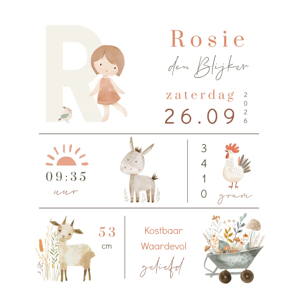 Dit geboortekaartje voor een meisje met boerderij dieren is een prachtige keuze voor de aankondiging van de geboorte van jullie dochtertje. Met schattige illustraties van een ezel, haan, geit en bloemen straalt dit kaartje een lieflijke en speelse sfeer uit. Bestel nu dit prachtige geboortekaartje Rosie en deel jullie vreugdevolle nieuws op een unieke en persoonlijke manier.