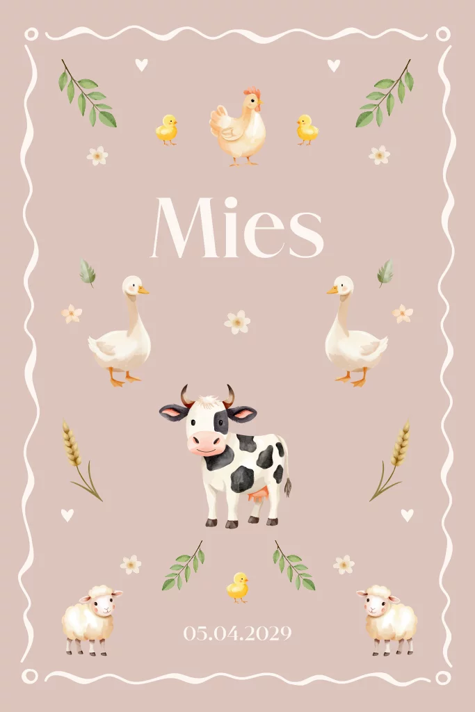 Een schattig geboortekaartje voor een meisje met getekende boerderijdieren illustraties. Dit geboortekaartje Mies bevat illustraties van een koe, schapen, ganzen en kipjes. Het golvende kader en de ronde hoeken zorgen voor een speels effect. Pas alles naar eigen wens aan in de online editor. Met de berry envelopkleur maak je dit kaartje voor jullie dochter helemaal in stijl af.