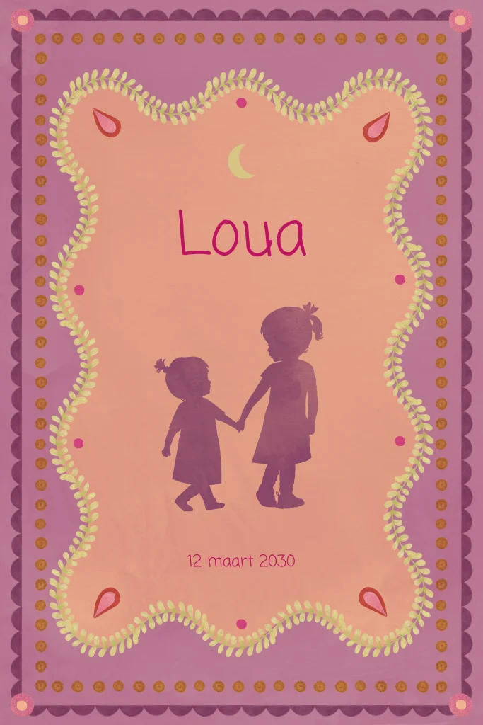 Bijzonder geboortekaartje voor een meisje, een tweede kindje! Dit geboortekaartje Loua heeft een boho eclectic ontwerp in paarse en oranje tinten. Het geboortekaartje heeft verschillende vintage kaders van stippen, golven en maan. In het kader zie je een silhouet van twee zusjes, een grote zus met haar kleine zusje. Ze lopen hand in hand. Pas de teksten, kleuren en lettertypes naar je eigen smaak aan in de editor. Ook kun je zelf bepalen of je ronde hoeken wilt.