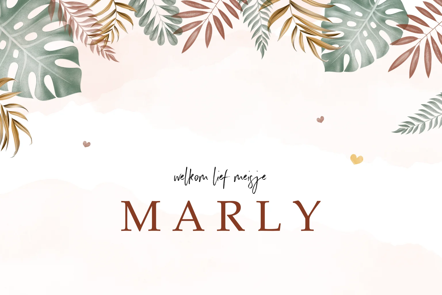Geboortekaartje voor een meisje met botanische bladeren in zachte kleuren. Dit kaartje Marly heeft op de achtergrond een roze aquarel. Teksten en kleuren zijn aan te passen in de editor.