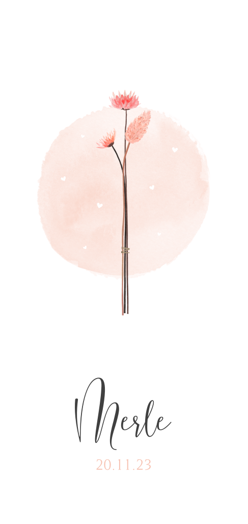 Geboortekaartje voor een meisje met een lief en rustig design. Op dit kaartje Merle staat een aquarel cirkel met 3 kleine gedroogde bloem takjes en kleine hartjes. De teksten en kleuren zijn eenvoudig aan te passen.