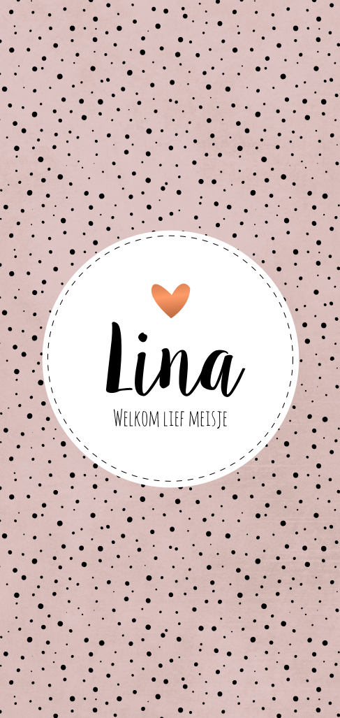 Hip geboortekaartje voor een dochter met op de achtergrond een stippen patroon. De babynaam Lina staat in een cirkel. Op de achterzijde worden de geboortegegevens weergegeven met symbolen. Teksten en kleuren zijn aan te passen in de editor.