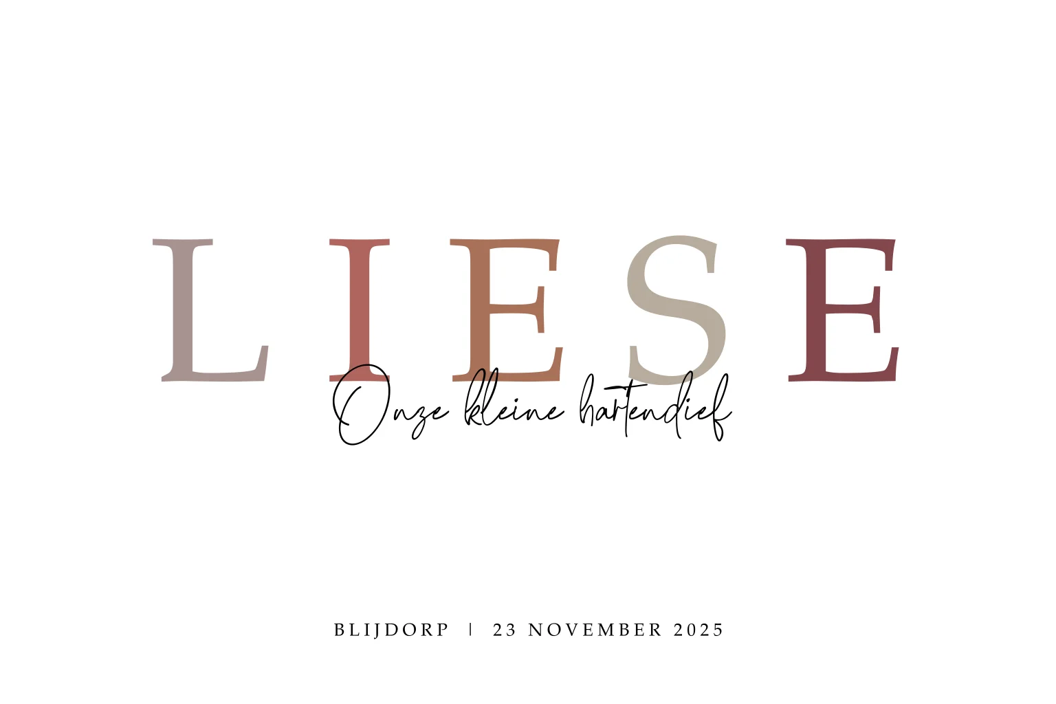 Geboortekaartje voor een meisje met een cleane uitstraling en de babynaam groot op de voorzijde van de kaart in trendy kleuren. Op dit kaartje staat de naam Liese in een strak lettertype, met daaronder de tekst "Onze kleine hartendief" in een sierlijk lettertype. De kaart is naar wens aan te passen in de editor. Hulp nodig? Wij helpen je graag verder.