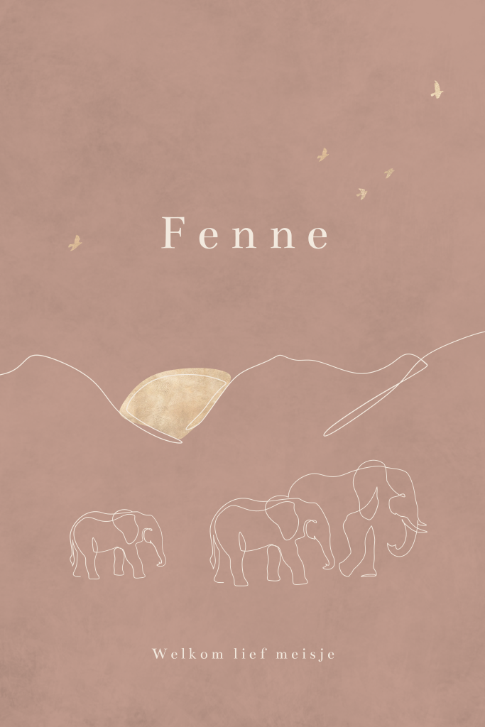 Meisjes geboortekaartje met one line illustraties van schattige olifantjes. Dit dieren kaartje Fenne heeft een roze velvet / velours look achtergrond. De teksten en de lijntekening in het wit komen hierop mooi naar voren. Verder op dit kaartje enkele goudkleurige vogeltjes en een ondergaande zon. Pas dit babykaartje naar je eigen smaak aan in de editor.