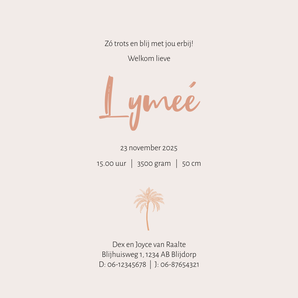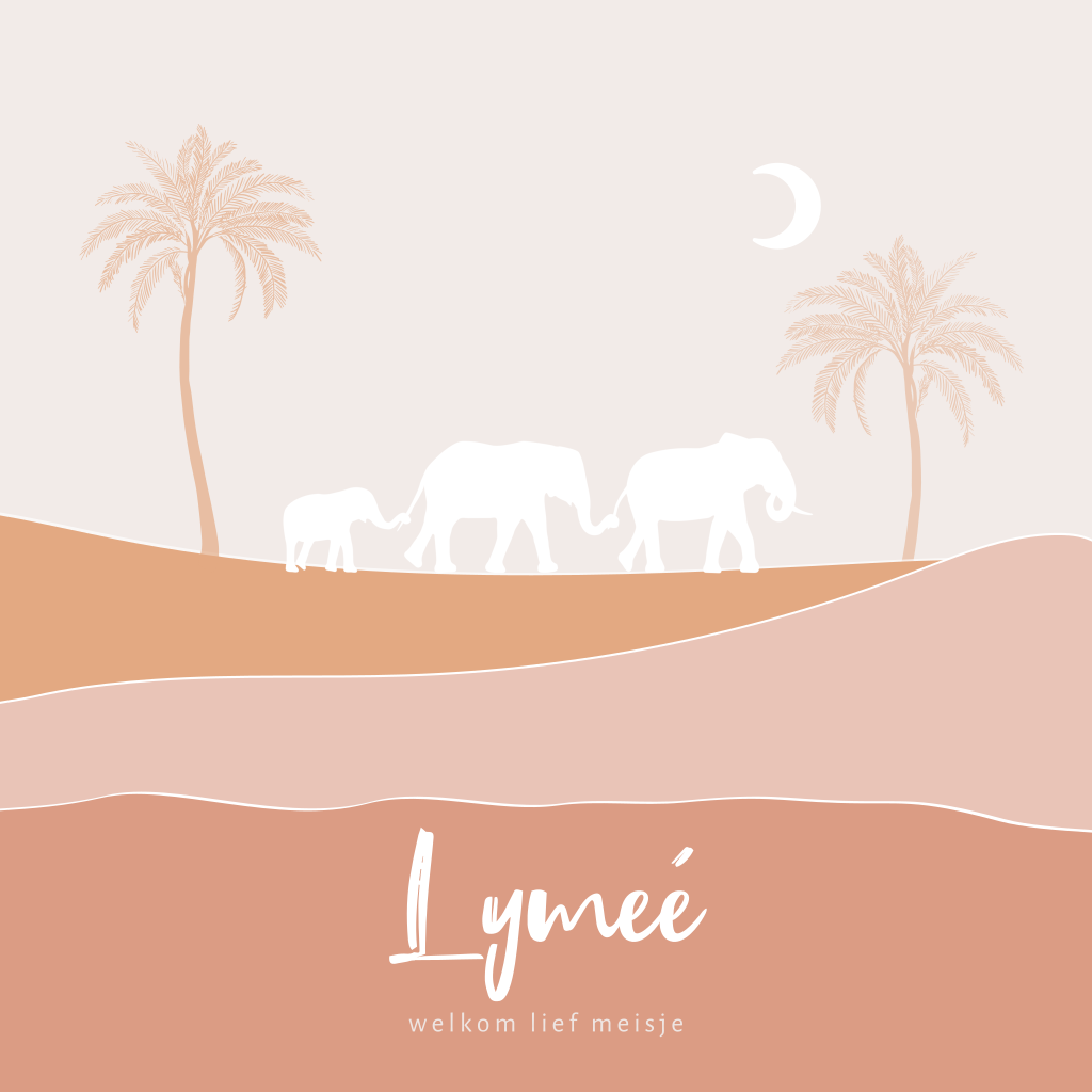 Meisjes geboortekaartje in jungle thema en trendy kleuren. Op dit kaartje Lymeé lopen 2 grote olifanten met erachter een lief klein baby olifantje in een glooiend safari landschap met palmbomen. Liever andere kleuren of lettertypes? Pas het gemakkelijk aan in onze editor.