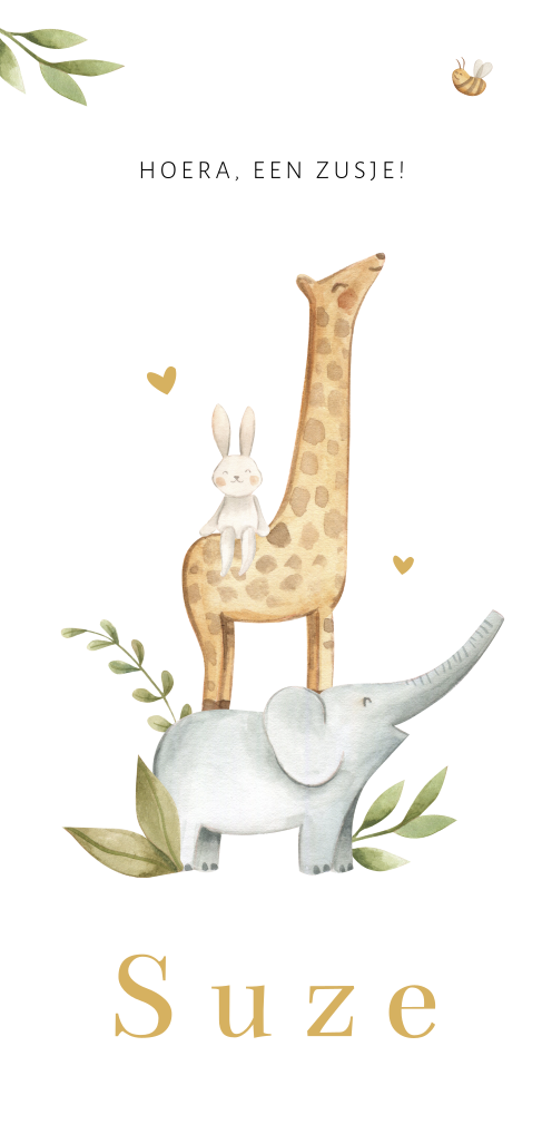Een lief geboortekaartje voor een meisje. Op dit babykaartje Suze staan drie dieren boven op elkaar, wat een grappig effect geeft. Dit zijn een olifantje, giraffe en een konijntje. Verder op dit kaartje enkele takjes, een bij en kleine hartjes. Wil je meer, of andere afbeeldingen toevoegen passend bij dit thema, dan kun je deze afbeeldingen vinden in de editor in het mapje: Thema Lief Aquarel. Ook de teksten en kleuren zijn naar wens aan te passen.