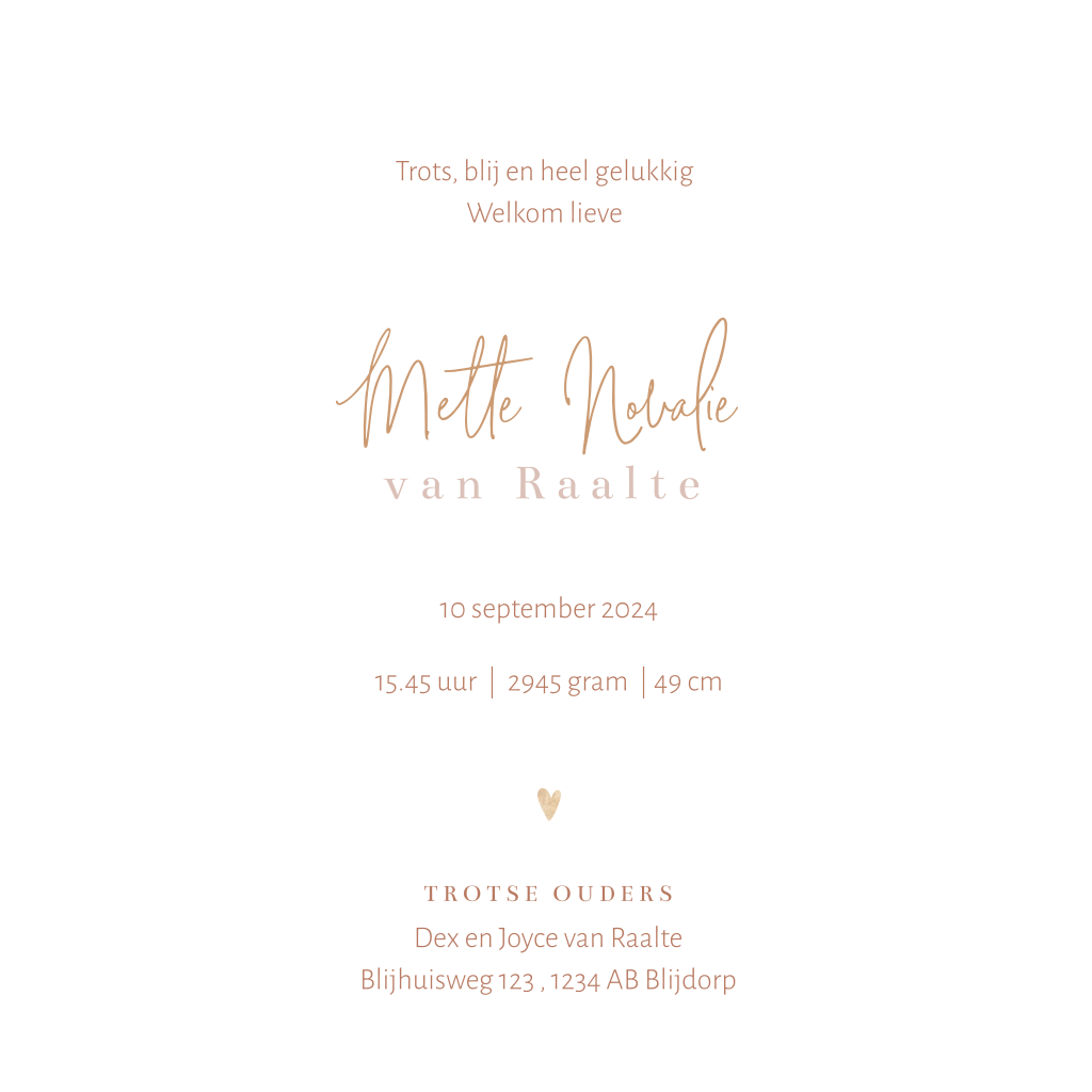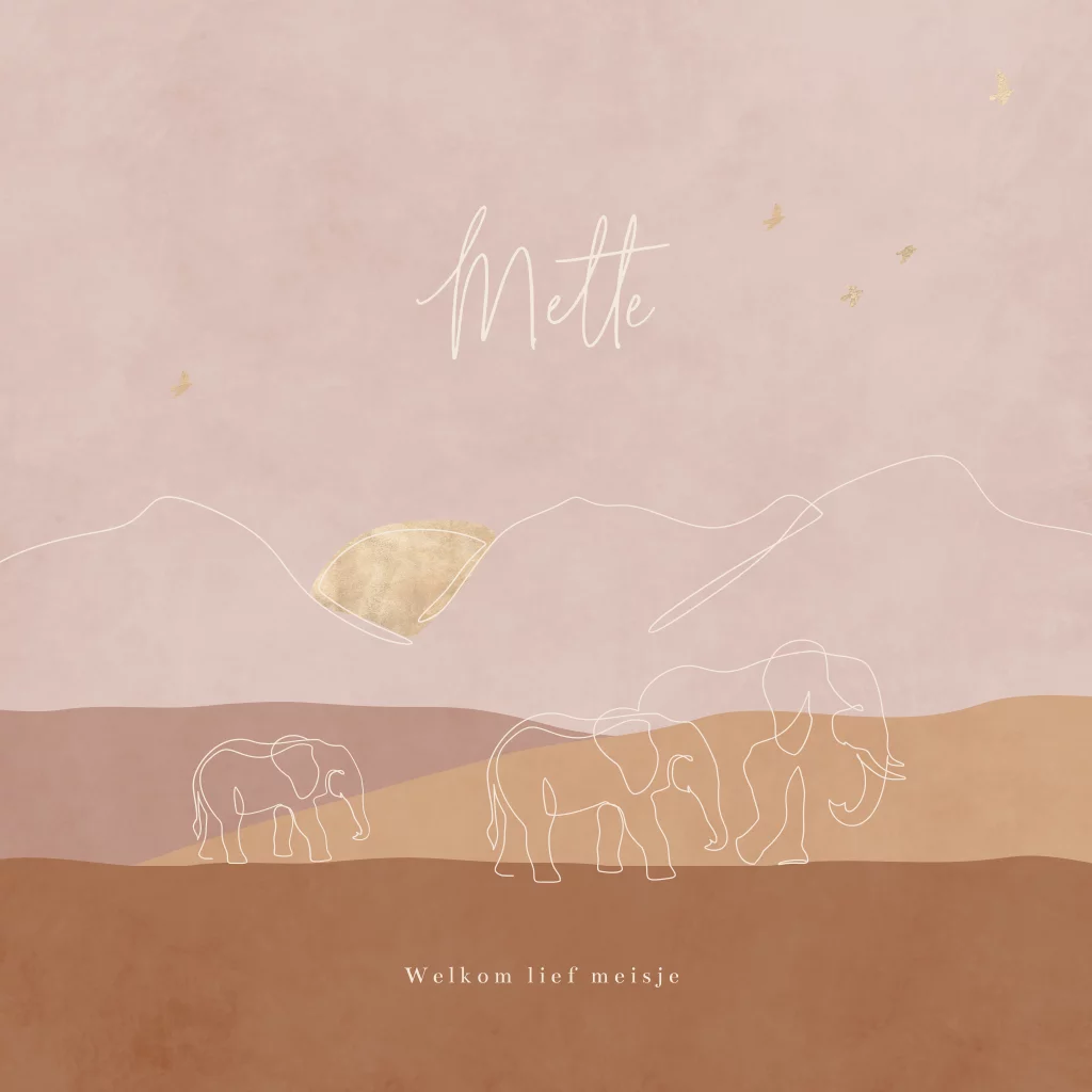 Geboortekaartje voor een dochter met one line illustraties van schattige olifantjes. Dit dieren kaartje Mette heeft een velvet / velours look achtergrond in verschillende roze tinten. De teksten en de lijntekening in het wit komen hierop mooi naar voren. Verder op dit kaartje enkele goudkleurige vogeltjes en een ondergaande zon. Pas dit meisjeskaartje naar je eigen smaak aan in de editor.