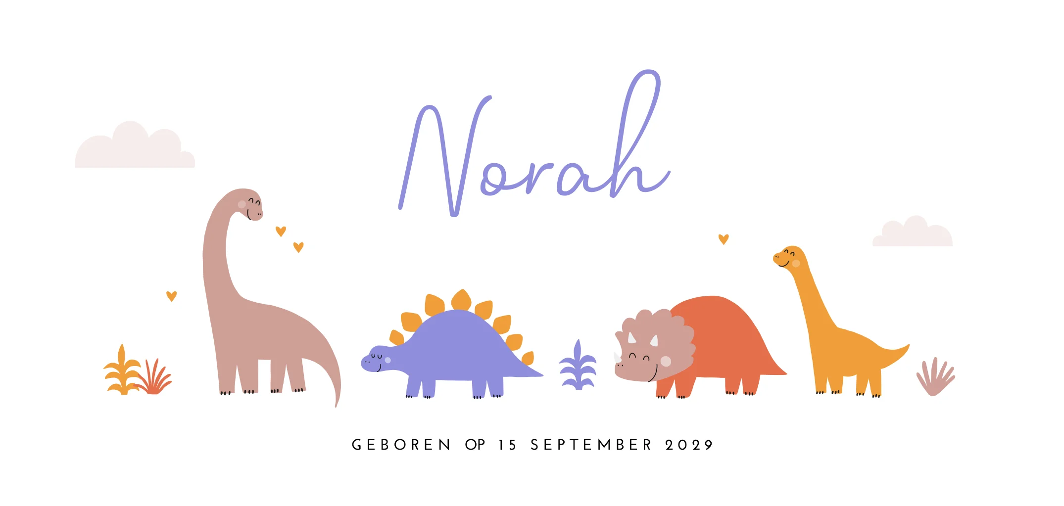 Vrolijk geboortekaartje voor een meisje, jullie dochter! Op dit kaartje een witte achtergrond met dinosaurussen in hippe trendy kleuren. De dino's zijn geïllustreerd in vrolijke kleuren, de hartjes geven het totaal een lieve uitstraling. De kleuren zijn gemakkelijk aan te passen in onze editor. Hulp nodig? Wij helpen je graag verder.