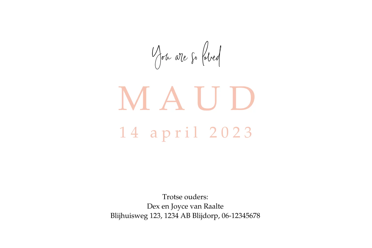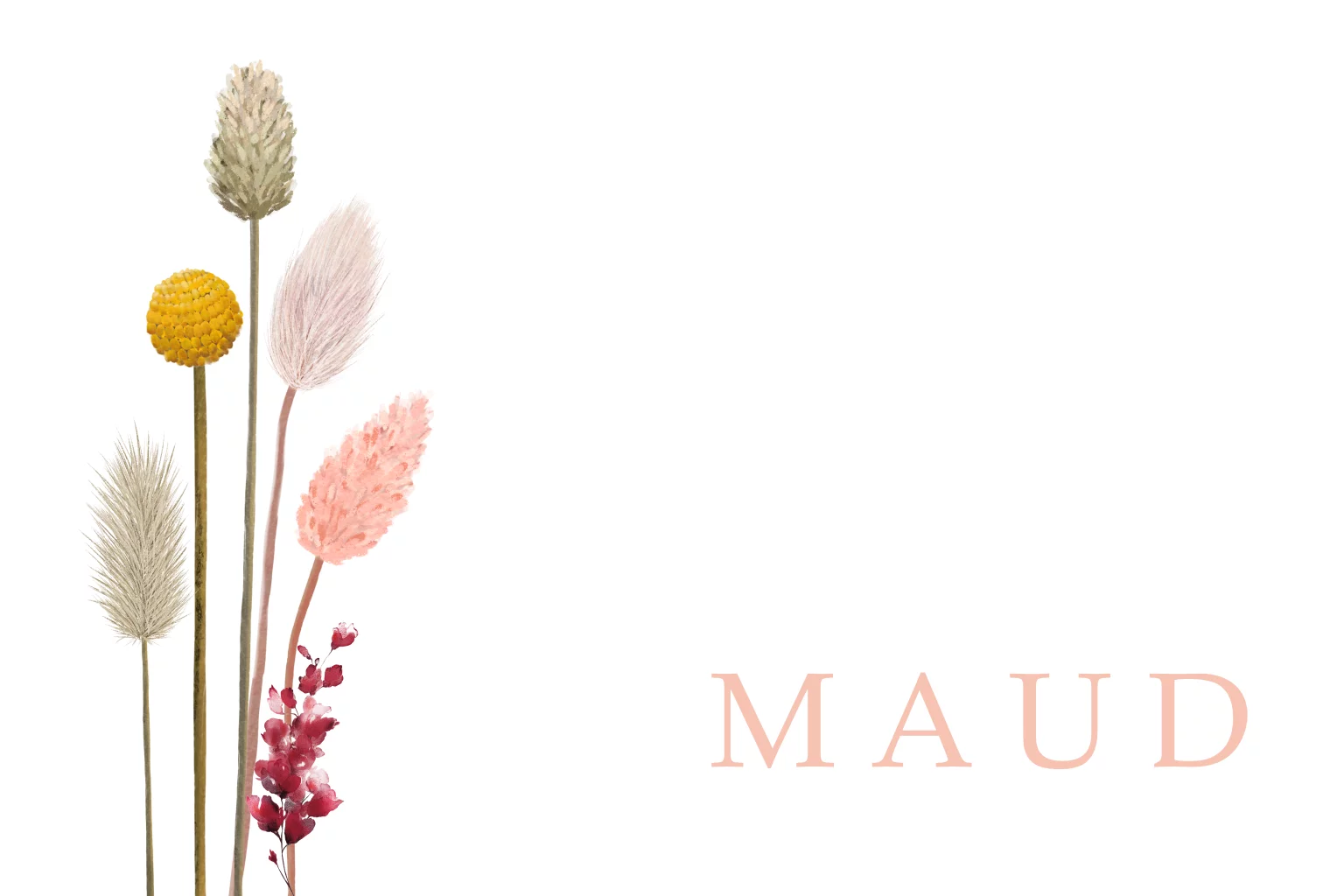 Lief geboortekaartje voor een dochter met een rustig design. Op de voorzijde van dit babykaartje Maud staat de naam in een strak lettertype en mooie droogbloemen takjes. Teksten en kleuren zijn aan te passen in de editor.