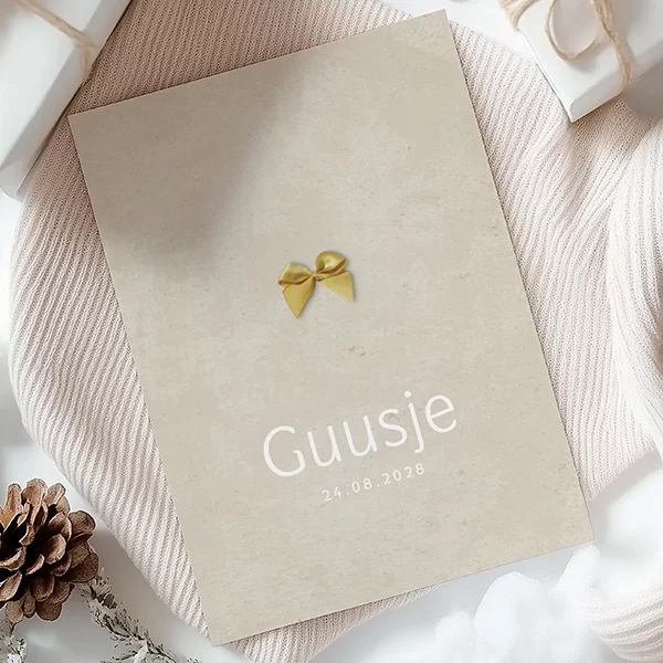 Meisjes geboortekaartje met beige betonlook achtergrond en echt gouden strikje. Dit kaartje Guusje is basic, trendy en exclusief tegelijk. Het strikje op dit kaartje dient als voorbeeld en wordt niet gedrukt! Op die plek kun je straks zelf het échte strikje plakken. Ga direct naar:
