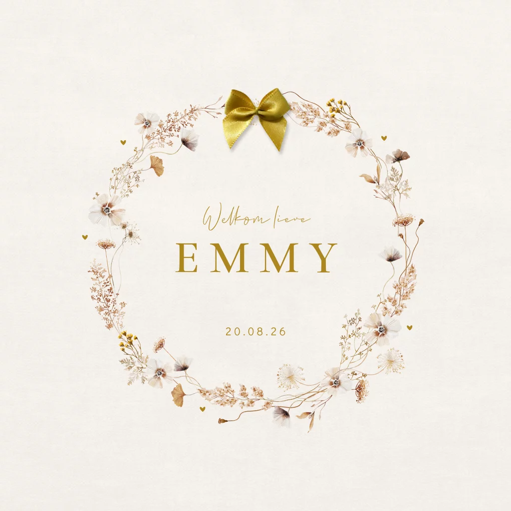 Meisjes geboortekaartje met mooie aquarel veldbloemen in een krans en een lichte linnenlook achtergrond. Het strikje geeft de kaart een romantische uitstraling. De teksten en lettertypes van dit kaartje Emmy zijn aan te passen in de editor.