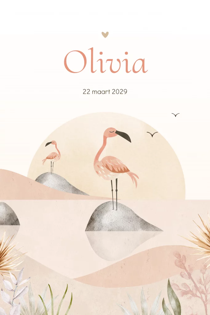 Flamingo geboortekaartje voor een meisje. Dit meisjes geboortekaartje Olivia heeft zachte roze kleuren met een illustratie van een zee met rotsen, bladeren en flamingo's. De ronde hoeken geven een speelse touch aan dit overwegend rustige geboortekaartje. Pas de teksten, kleuren en lettertypes eenvoudig aan in de editor.
