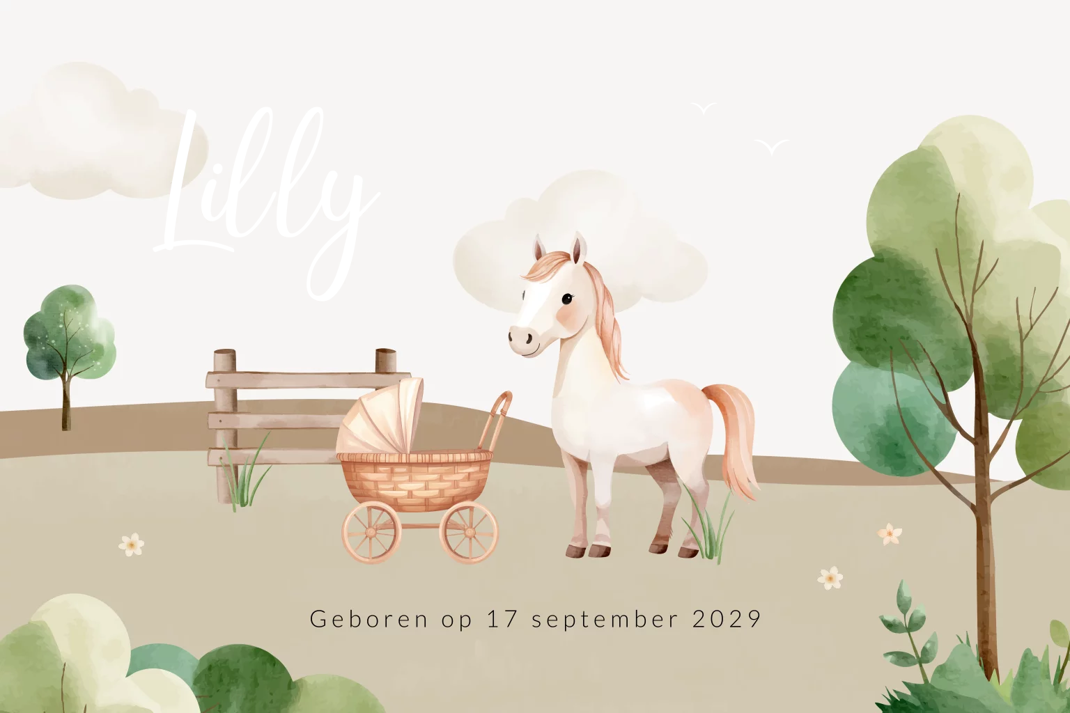Paarden geboortekaartje voor een meisje. Wonen jullie op een boerderij, hebben jullie paarden of ben je een paardenliefhebber? Dan is dit geboortekaartje voor een meisje zeker een aanrader! Je ziet een kinderwagen in een landschap staan met een mooi paard erbij. De goudfoliedruk en afgeronde hoeken maken dit geboortekaartje Lilly helemaal af. Pas deze kaart naar eigen wens aan in onze online editor.