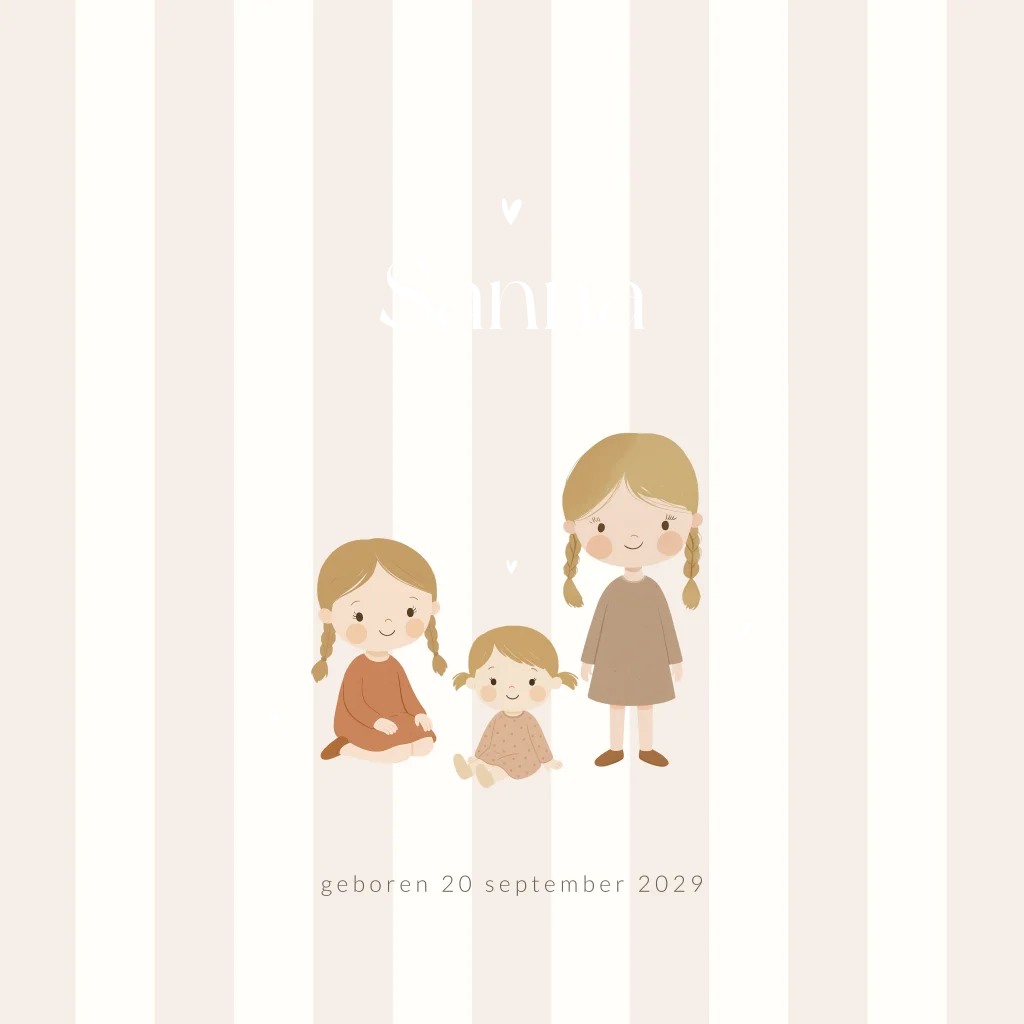 Lief geboortekaartje voor een meisje, een derde kindje. Op dit geboortekaartje Sanna zie je drie zusjes omringd door hartjes in goudfolie. De achtergrond heeft een beige streeppatroon.