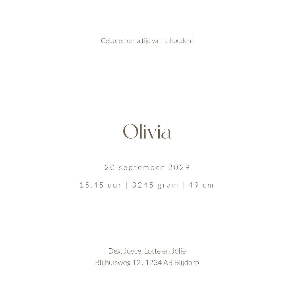 Pas dit geboortekaartje Sanna naar je eigen smaak aan in de editor en combineer met een mooie metallic beige envelop en sluitzegel om het helemaal af te maken. Dit kaartje is ook mogelijk in een andere gezinssamenstelling.