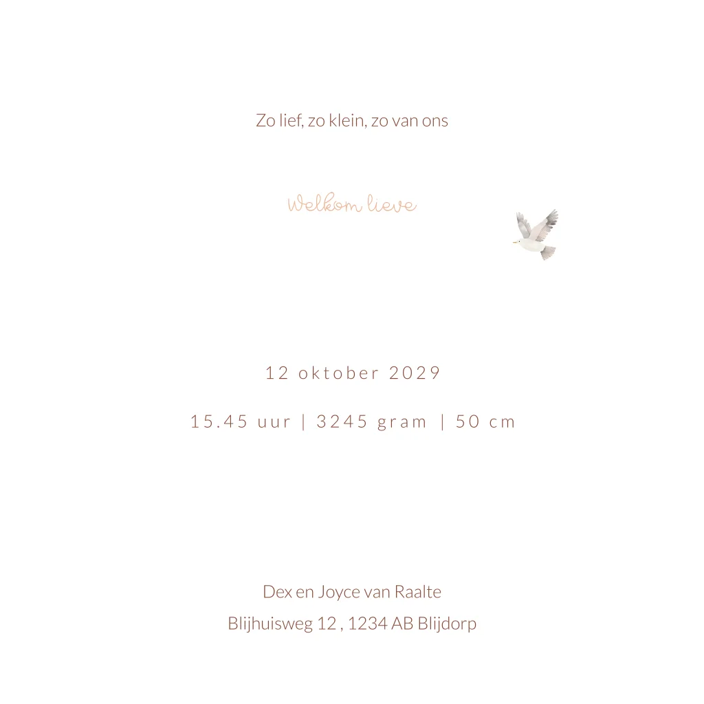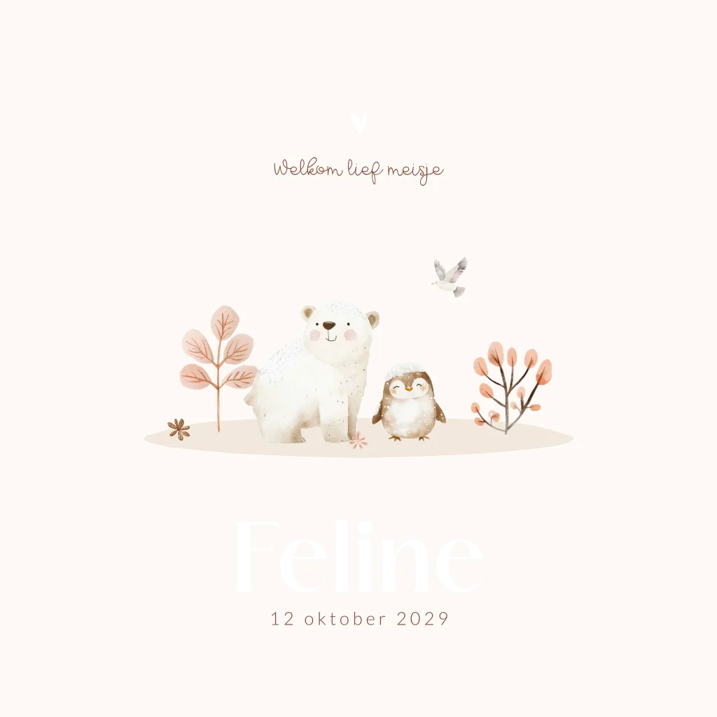 Een schattig geboortekaartje voor een meisje! Dit geboortekaartje Feline heeft een schattige uitstraling door de lieve illustraties van een ijsbeer, pinguïn en vogeltje. De beige achtergrond en het goudfolie zorgen voor een luxe sfeer. De bijpassende sluitzegel en roze envelop maken dit geboortekaartje in winterse sferen voor jullie dochter helemaal in stijl af.