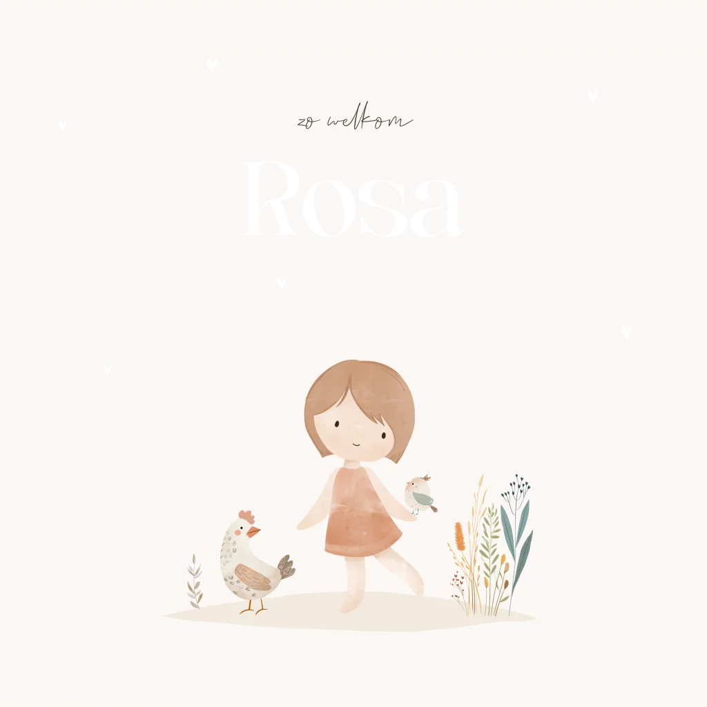 Handgetekend geboortekaartje voor een meisje. Op dit geboortekaartje Rosa zie je een illustratie van een meisje met een kip en vogel. Op de achtergrond zie je hartjes in roségoud folie. De kleuren, afbeeldingen en lettertypes pas je heel eenvoudig zelf aan in onze editor.