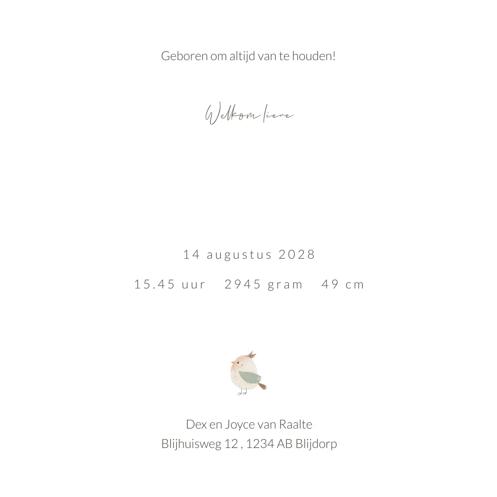 Getekend geboortekaartje voor een meisje met vogels en foliedruk