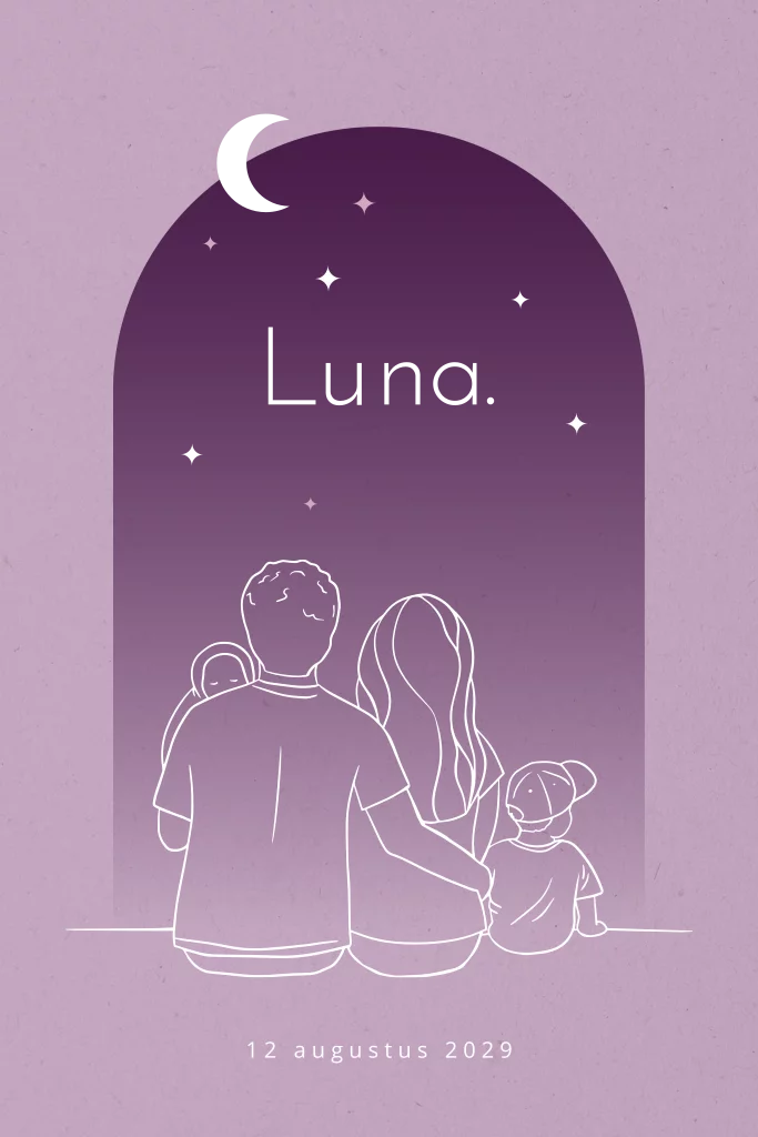 Een lijntekening geboortekaartje voor een meisje! Dit geboortekaartje Luna bevat een lijntekening van een gezin met vier personen. Je ziet vader, moeder, grote broer en het baby zusje. Het gezinnetje kijkt naar de sterren en de maan. Vandaar ook de toepasselijke naam Luna. Dit kaartje bevat goudfolie voor een extra luxe uitstraling. Pas dit kaartje voor jullie dochter naar eigen wens aan in onze online editor. Hulp nodig met ontwerpen? Ons team helpt je graag.