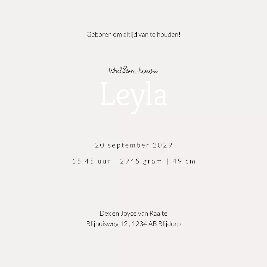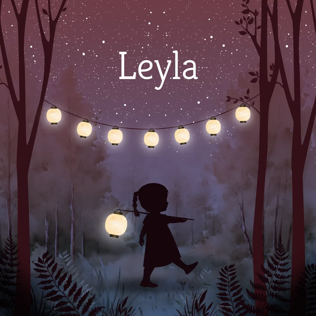 Origineel en bijzonder geboortekaartje voor een eerste kindje, een meisje. Op dit geboortekaartje Leyla zie je een silhouet van een meisje met een lampion, lopend door het bos in de nacht onder de sterren. De naam van jullie baby en de sterren worden gedrukt in holografisch folie wat perfect past bij de nacht. Personaliseer het kaartje met jullie eigen tekst en maak het helemaal af.