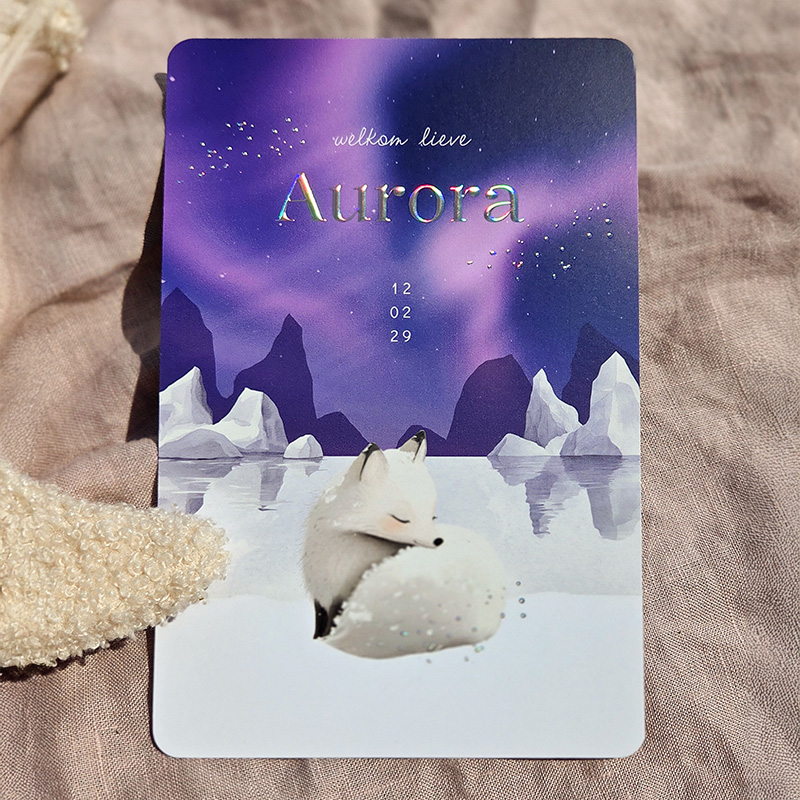 Bijzonder geboortekaartje voor een meisje met poolvos en noorderlicht