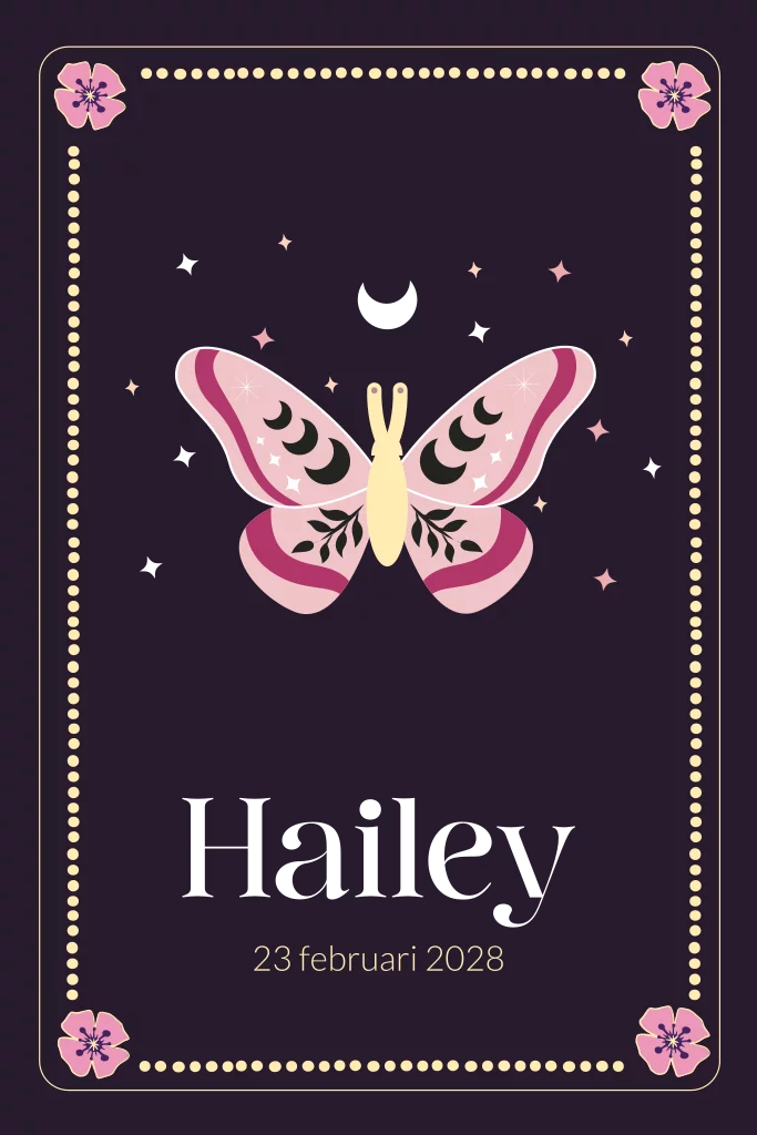 Prachtig boho geboortekaartje met een zwarte achtergrond en de afwerking met goudfolie. De vlinder met roze tinten en de bloemetjes in de hoekjes passen heel mooi in het geheel. Dit geboortekaartje Hailey heeft ook nog kleine maantjes en sterretjes in goudfolie!