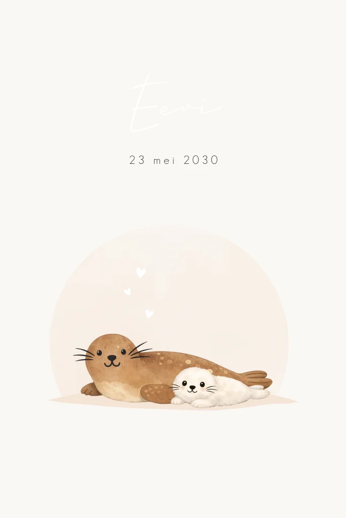 Lief geboortekaartje voor een meisje met zeehonden. Je ziet op dit geboortekaartje Eevi een moeder zeehond met haar pup. In roségoud folie worden de hartjes en de naam van jullie dochter gedrukt. Pas de teksten, kleuren en lettertypes naar je eigen smaak aan in de editor. Ook kun je zelf bepalen of je ronde hoeken wilt.
