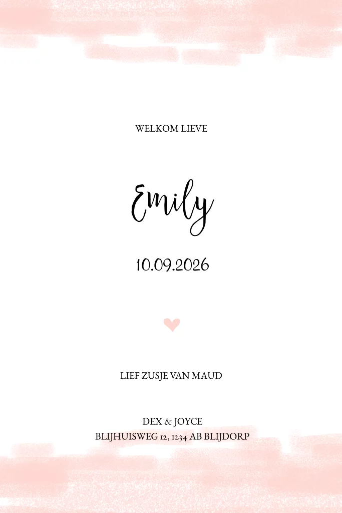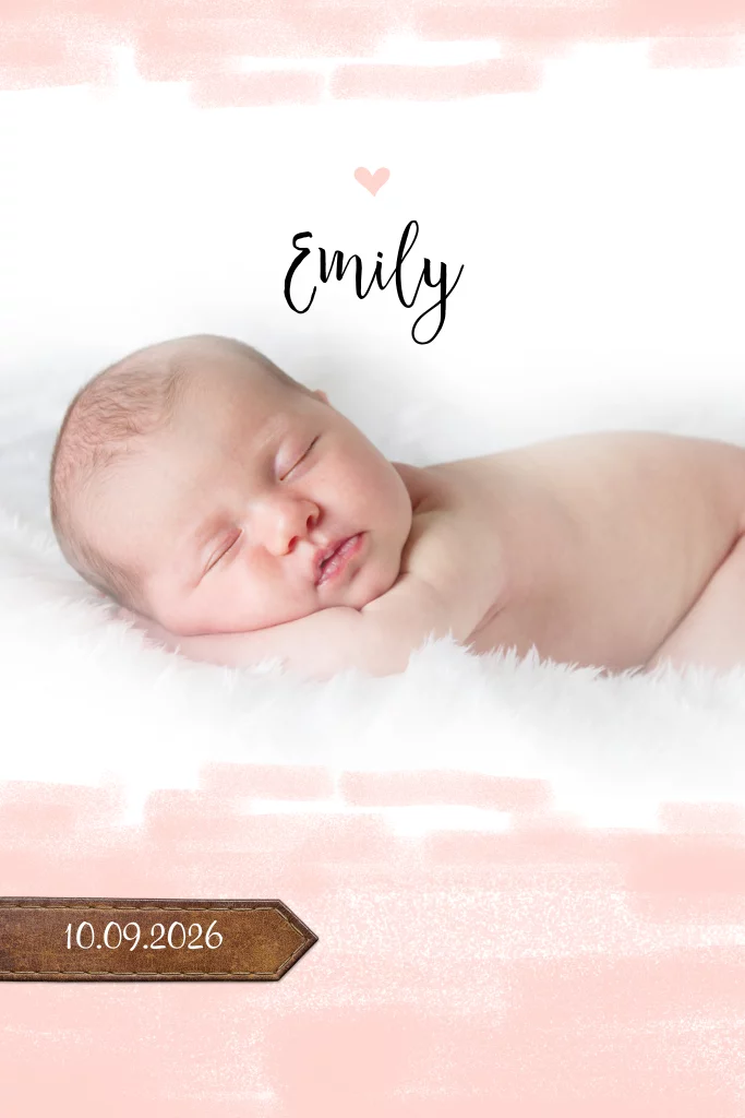 Geboortekaartje voor een meisje met roze aquarel en een eigen foto. De datum staat in een leren label. Aan de binnenkant van dit kaartje Emily komen deze elementen allemaal weer terug