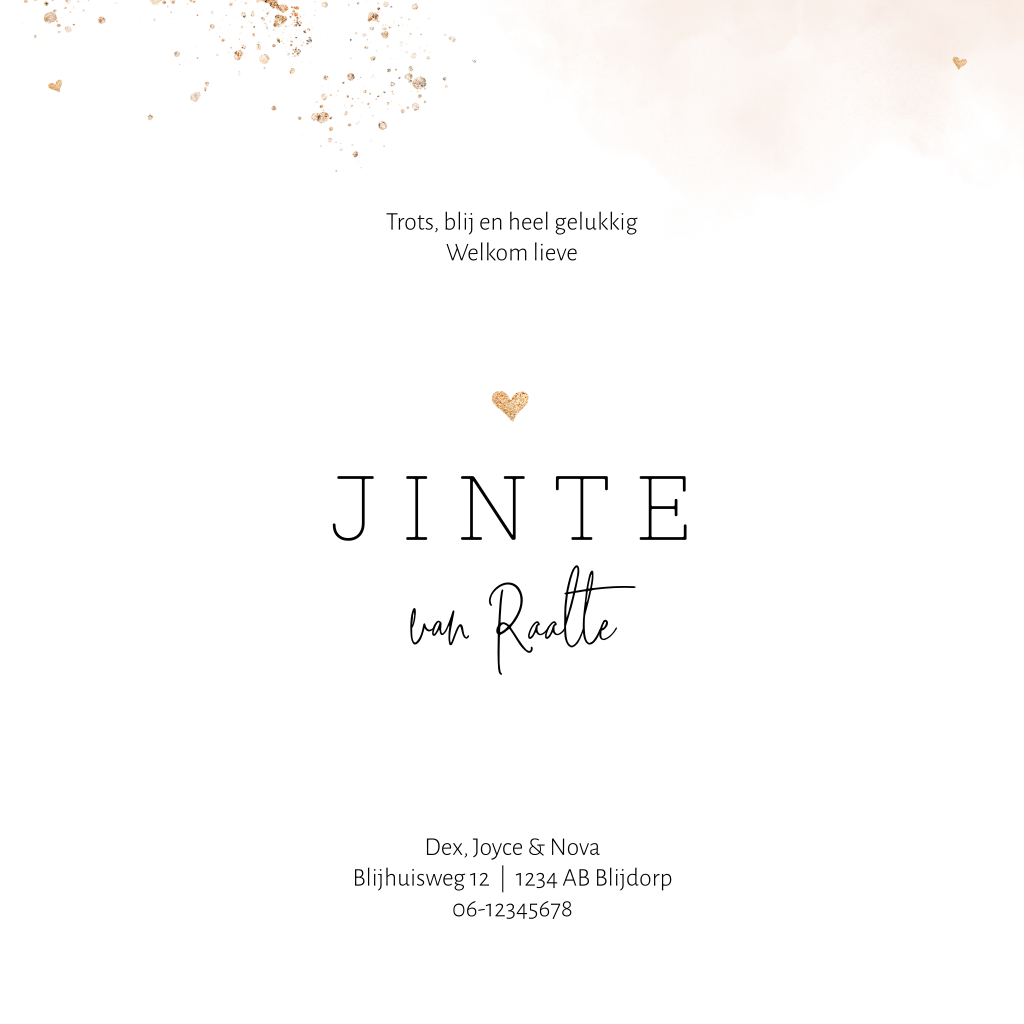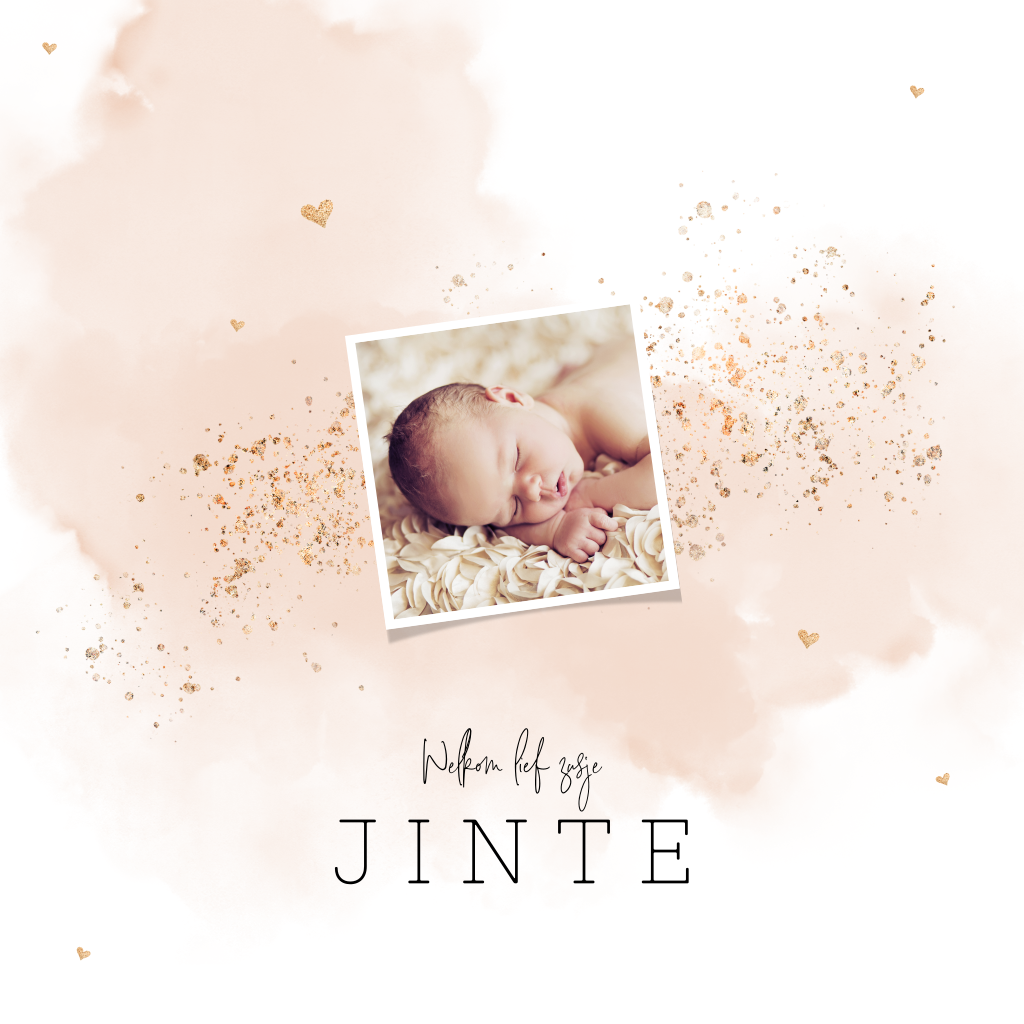 Geboortekaartje voor een dochter met op de voorzijde ruimte voor een mooie foto. Dit kaartje heeft een roze aquarel achtergrond en kleine goudkleurige spetters en hartjes. De combinatie van roze watercolor met de gouden accenten geven een mooi effect. Dit kaartje Jinte is naar je eigen smaak aan te passen in de editor.