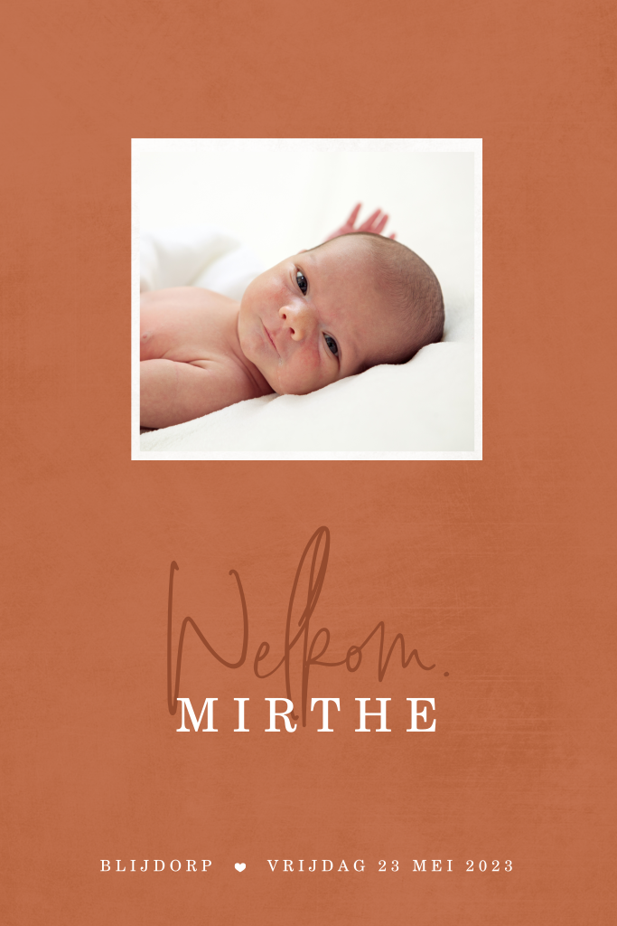 Basic geboortekaartje voor een meisje in trendy kleuren. Plaats een mooie foto van jullie kindje op de voorzijde van dit kaartje Mirthe. Kleuren en lettertypes zijn aan te passen in de editor.