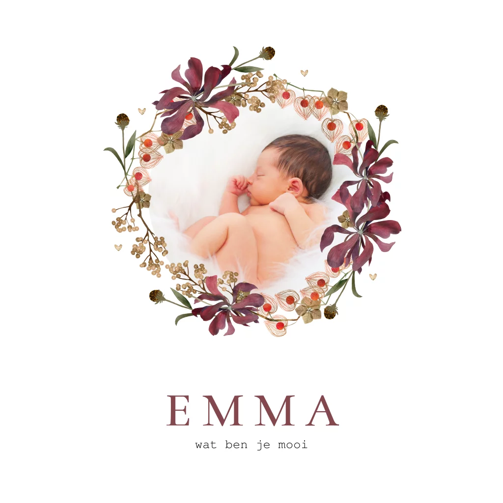 Lief foto babykaartje met bloemenkrans