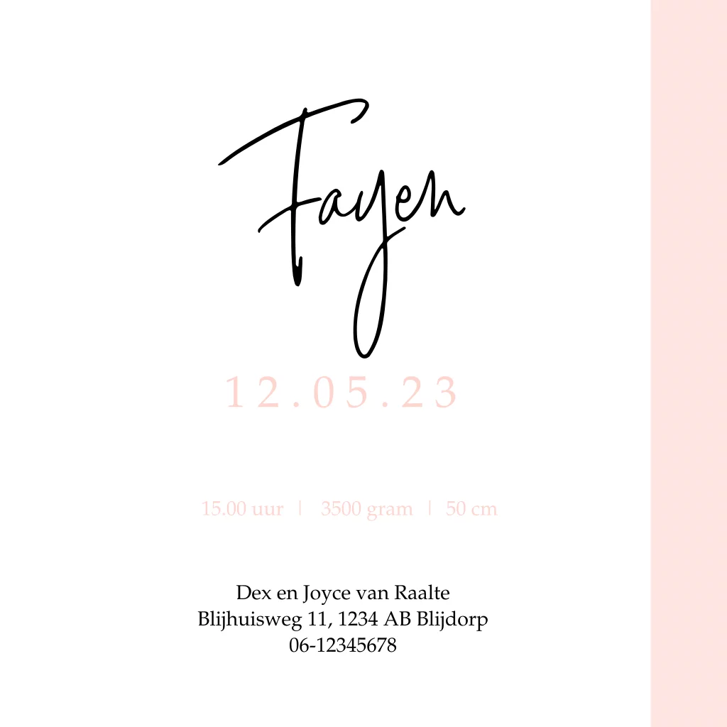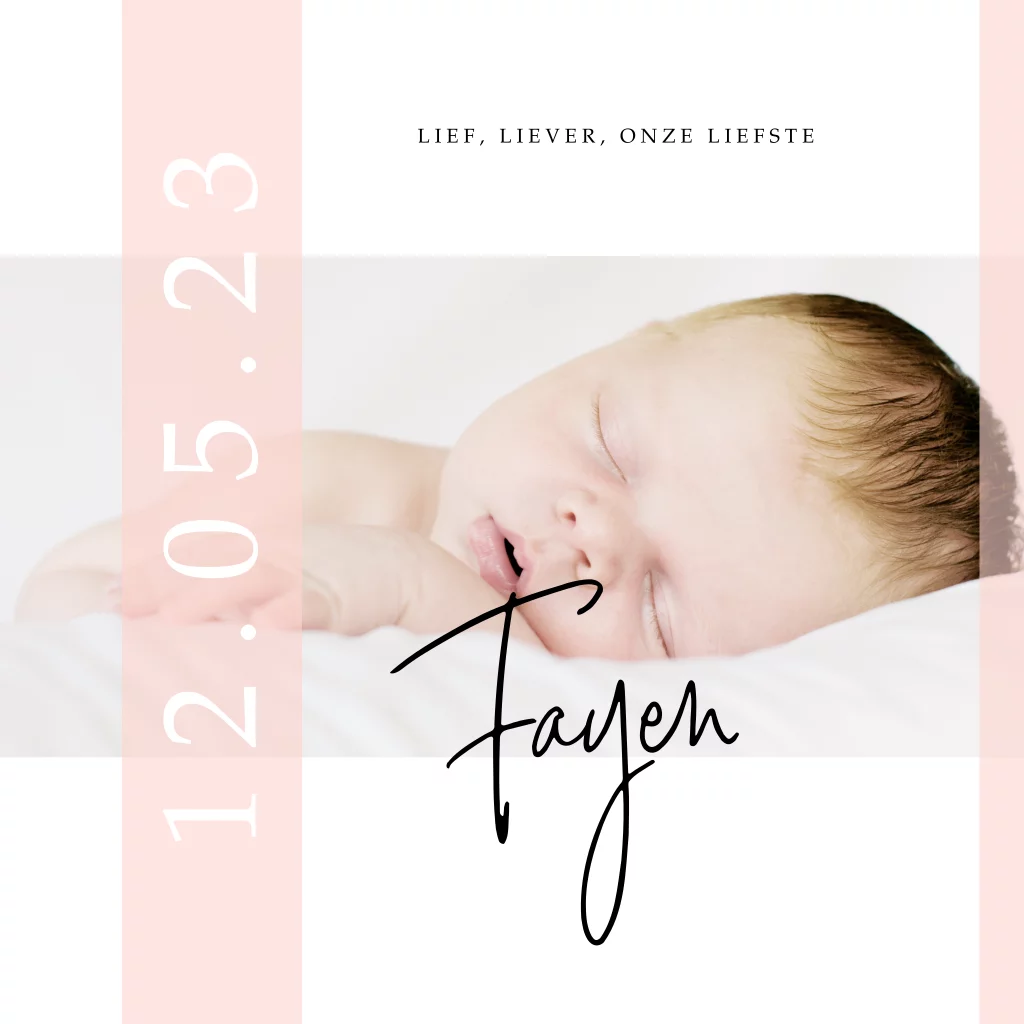 Clean geboortekaartje voor een dochter met eigen foto. Over de foto staat een smalle transparante balk waarin de geboortedatum staat. De babynaam Fayen staat in een speels lettertype geschreven. Teksten en kleuren pas je gemakkelijk aan in de editor.