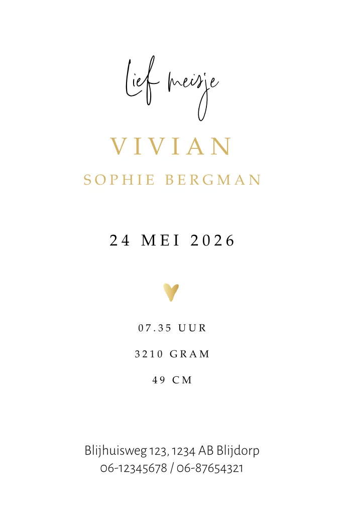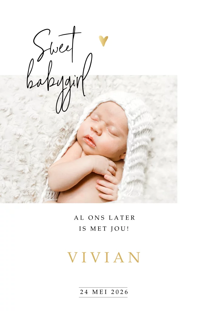 Een stijlvol geboortekaartje voor een meisje met rustige uitstraling. De kaart is clean met naast zwart en wit een vleugje goud. Plaats een foto van jullie sweet babygirl om er je persoonlijke kaartje van te maken.