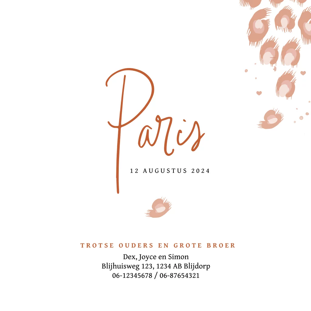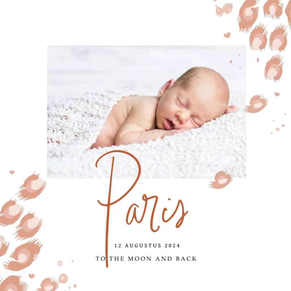 Geboortekaartje voor een dochter met foto en dierenpatroon. De babynaam Paris staat in een mooi sierlijk lettertype. Het kaartje is overwegend wit gecombineerd met trendy roestbruin. Pas de kleuren en lettertypes naar je eigen smaak aan in de editor.