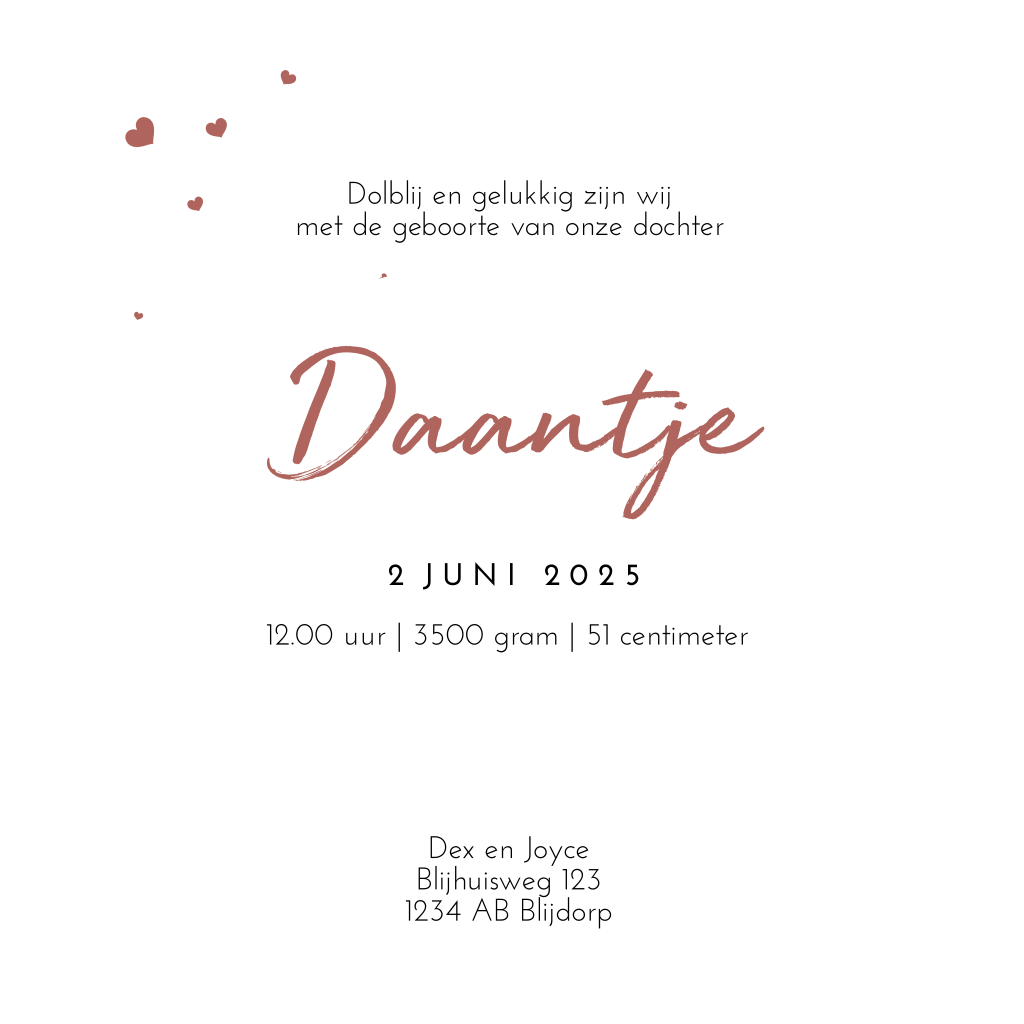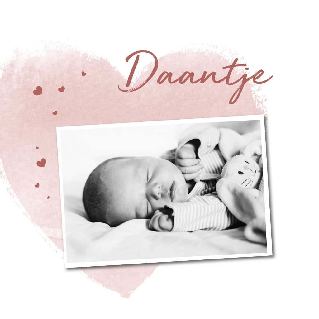 Dit lieve geboortekaartje met eigen baby foto is voor een meisje. Het grote zalm roze aquarel hart en de kleine hartjes geven de kaart een lieve uitstraling. De foto op de voorzijde maakt de kaart extra persoonlijk. Liever een ander kleurtje dan zalm roze? Deze babykaart pas je gemakkelijk zelf aan!