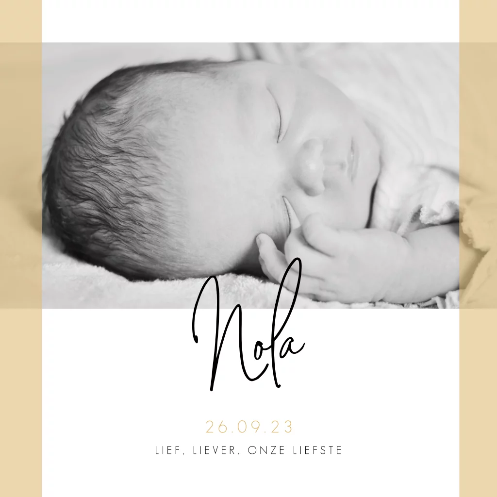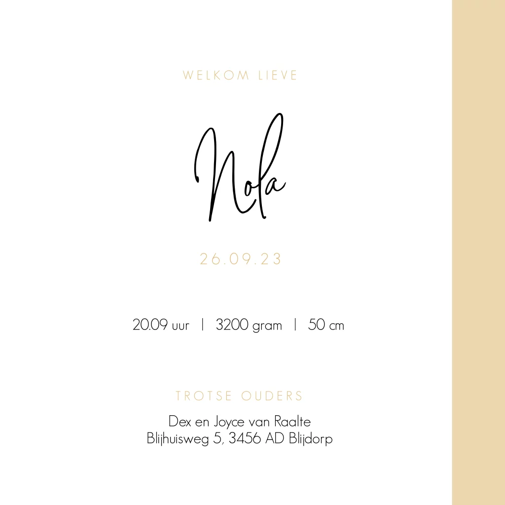 Geboortekaartje voor een meisje met een mooie foto groot op de voorzijde. Aan de zijkant van dit kaartje Nola staan goudkleurige randen welke een mooi effect geven. Kleuren en teksten zijn aan te passen in de editor.