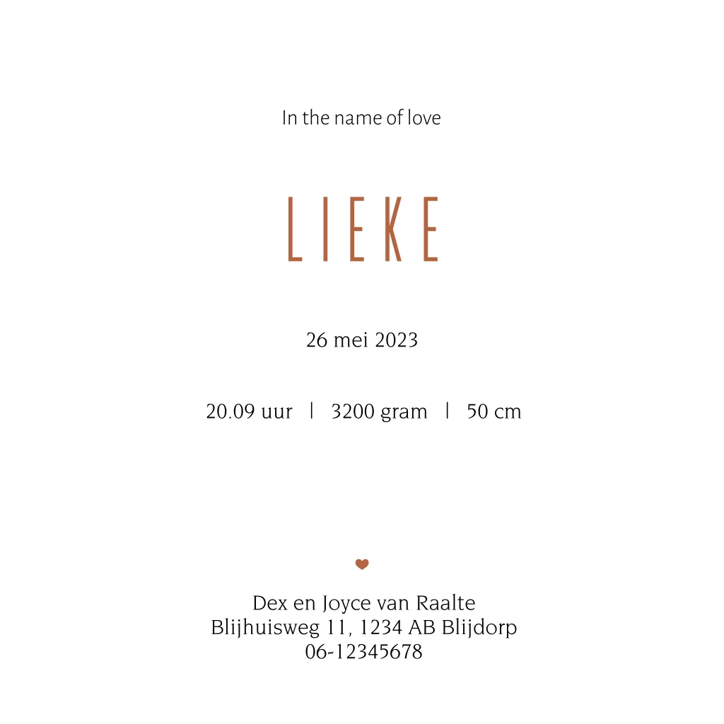 Geboortekaartje voor een meisje waarop een mooie foto centraal staat. Verder is de kaart rustig en clean. Kleuren en lettertypes zijn aan te passen in de editor.