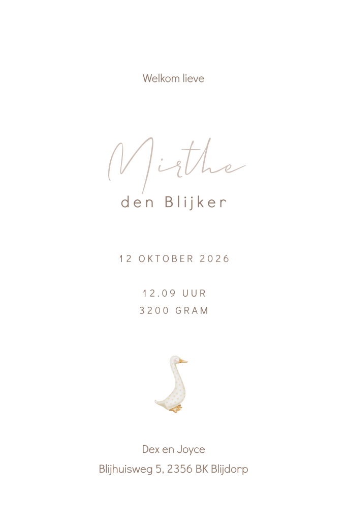 Welkom lief meisje! Laat iedereen weten dat jullie dochter is geboren met dit rustige geboortekaartje met ronde hoeken. Op dit babykaartje Mirthe een oudroze achtergrond met een lief gansje. Teksten en kleuren kun je aanpassen in de editor.