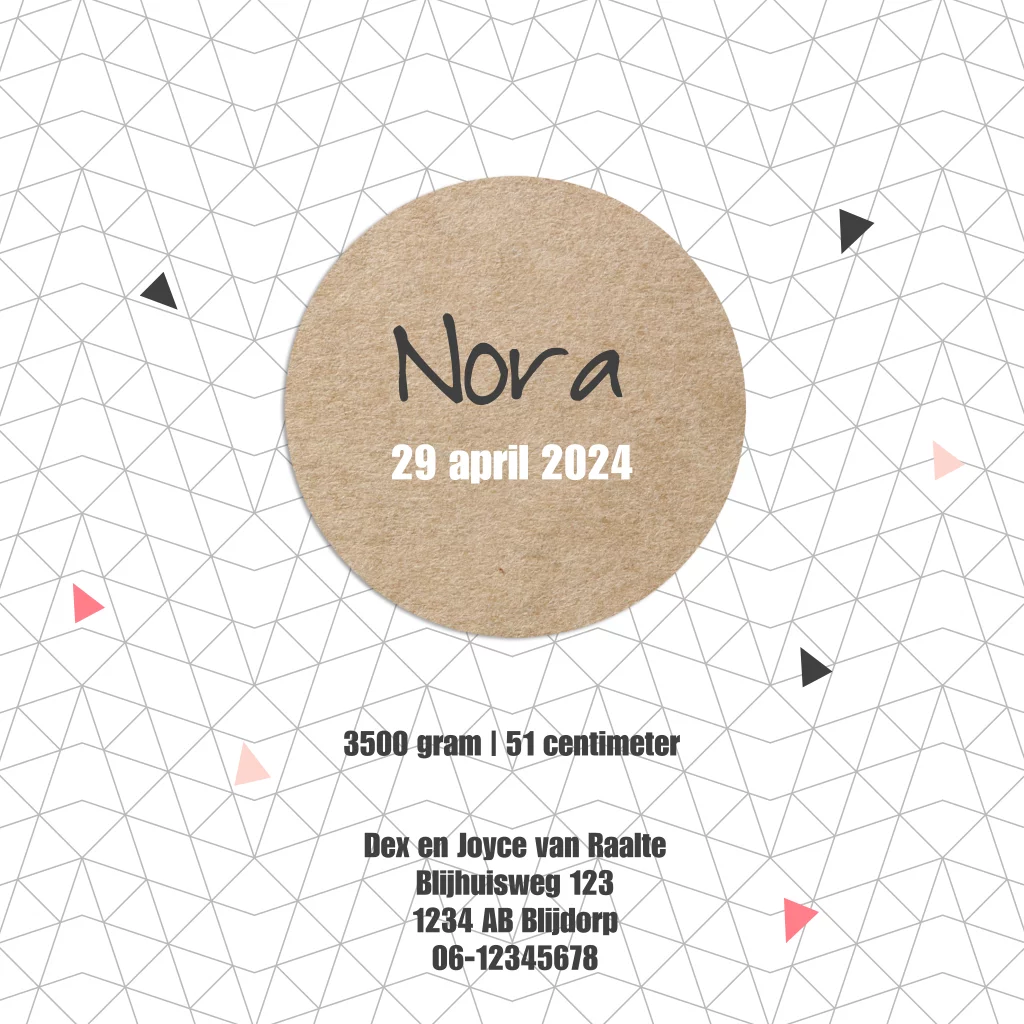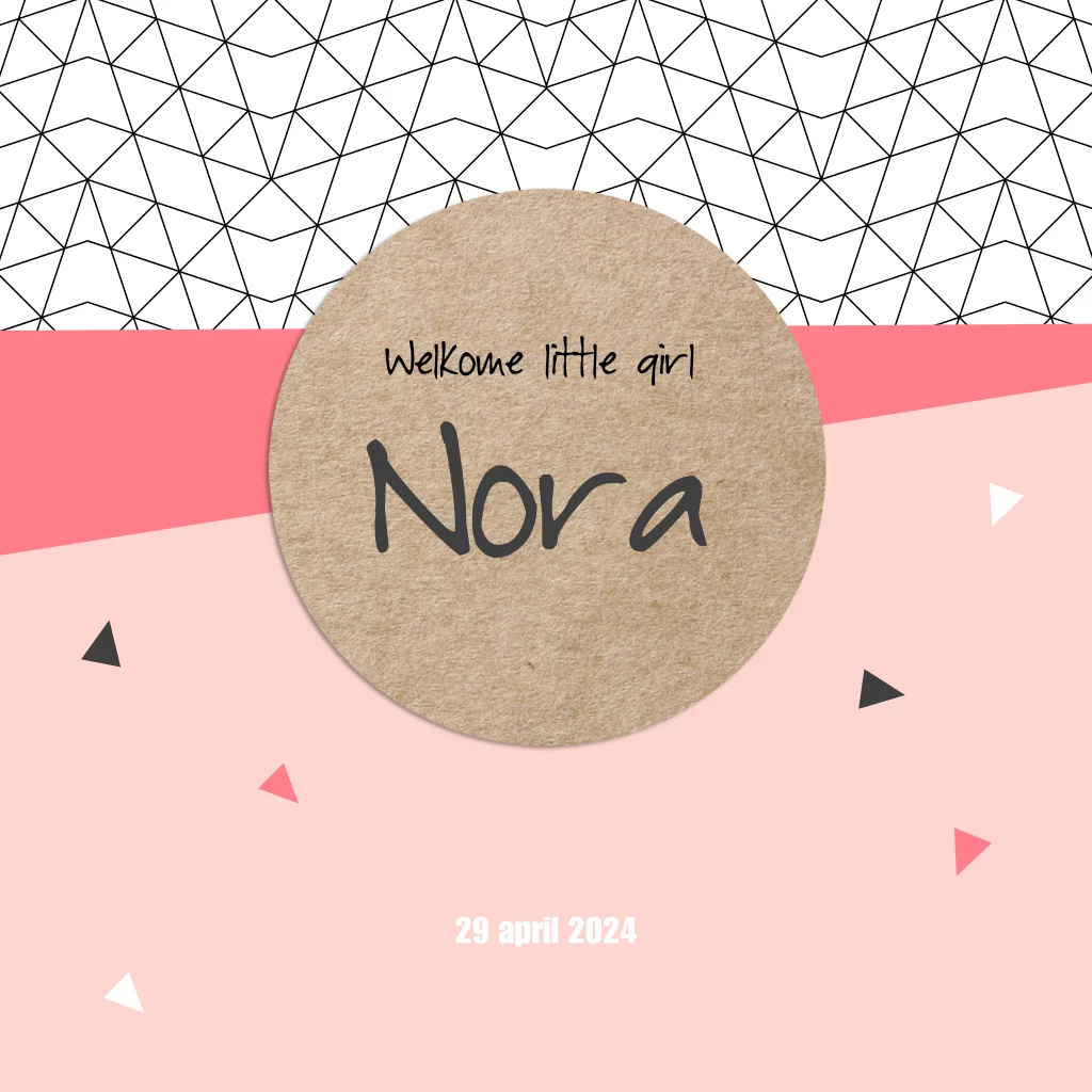 Dit hippe geboortekaartje met geometrische lijnen en vlakken is een echte eyecatcher. Dit meisjeskaartje heeft een kartonnen cirkel op de voorkant waar de babynaam in staat. De cirkel geeft samen met de kleine driehoekjes een speels effect. De kleuren zijn naar wens aan te passen.